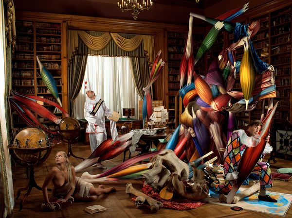 Arsen Savadov's photograph "Commedia dell'Arte in Crimea" presents a highly stylized, theatrical tableau. Its dominant visual experience hinges on the juxtaposition of opulence and absurdity, realized through a complex arrangement of figures and objects within a decaying aristocratic interior. The photograph's meaning arises from the tension between high and low culture, past and present. It can be interpreted as a commentary on the collapse of social structures. Savadov strategically deploys semiotic codes such as the rocket to disrupt fixed narratives. The inclusion of stock characters from Commedia dell'Arte serve not just as aesthetic choices but engage with themes of societal roles. Ultimately, the photograph’s meticulous composition underscores the inherent artifice and constructed nature of reality. The overall composition challenges fixed meanings, offering instead a meditation on the fluid and ever-shifting nature of cultural values.