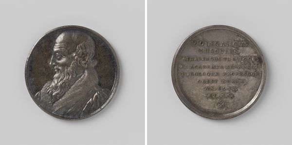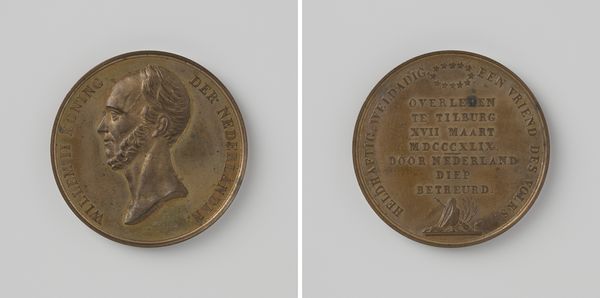 Curator: Welcome. We are looking at "Overlijden van Herman Boerhaave," a bronze relief created by Amédée Pierre Durand between 1822 and 1825. Editor: Oh, this piece. It strikes me as quite...stately, even solemn. You get the feeling you ought to be wearing your Sunday best. The material has that time-worn feeling. Curator: Durand's selection of bronze as a medium enhances the formality; its cool tonality and subtle play of light reinforce a sense of dignified remembrance. It’s interesting to note the inscription and the portrait, their positions and size relationship across the whole. Editor: That’s the real trick isn't it? To create the tension through that perfect relationship of all elements? It feels like a miniature monument. It packs so much, a life into such a small circumference. A whisper of what once was, echoing from two centuries away. Curator: Precisely. Consider also, if you will, the relief’s technical execution; the detailed carving work lends depth, particularly noticeable in the face of Boerhaave. The text on the other side it appears, conveys both personal history and historical importance with its density and style. Editor: Absolutely. And to know it’s a depiction of death…makes me appreciate the careful craftsmanship. You feel that attention. I guess, at its heart, art that is “good” makes us all the more aware of being “alive” or rather the very condition of mortality? Curator: I would concur. It is through engagement with form and its meticulous detailing and internal balance of the form where meaning unfolds and reveals something deeper and intrinsic beyond superficial observations. Editor: Right. And that deeper reflection—the bridge between maker and viewer through time—makes me oddly feel that the Herman might enjoy some good wine at some point in his life; at least that makes me relate to his historical impact personally somehow. Curator: A somewhat whimsical though plausible reflection. It is one of the qualities which brings Durand’s technical construction of a tribute to the end of life into the context of modern understanding. Editor: Precisely. It turns this object from an artistic marvel into something deeply human. Thanks for shedding light on the intricate artistry involved. Curator: It has been my pleasure. Thank you for your refreshing observations.
