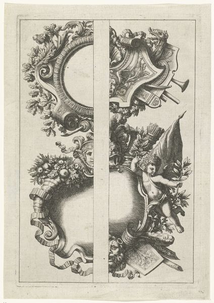 Curator: The print before us, "Console met bekroning," comes to us from between 1699 and 1726. This engraving is part of the Rijksmuseum's collection. What is your initial response? Editor: Intricate! I'm immediately drawn to the detailed symmetry, bisected so deliberately. There's a clear distinction in texture, form, and finish on either side that feels rather jarring, almost a study in contrasts. Curator: Indeed, it’s a fascinating demonstration. The division encourages us to deconstruct the individual components of Baroque design and, more broadly, its formal principles. We might consider how semiotics impact our reception of ornament here. Editor: And I wonder about its practical purpose within society then. Was this disseminated to potential clients or craftsman, informing the aesthetic choices in homes of a certain social strata, or perhaps churches and civic buildings of the period? Curator: Precisely! It serves as a catalogue for disseminating visual concepts of that era to craftsmen and architects across regions and, therefore, influences visual culture and architecture, thereby cementing particular aesthetics in the collective mindset. Look closely at the floral embellishments; consider how such designs served political purposes—displays of power. Editor: Absolutely. It’s not simply about decoration. The ornate detailing underscores prestige and aspiration, intended for spaces where wealth was performed and consolidated, reflecting power dynamics present across various sectors in that historical moment. This was a demonstration of luxury that mirrored existing socio-political systems. Curator: I see how you connect ornament and cultural expression, considering this architectural design's power. But zooming into this design, how does its geometry shape or misguide the viewer's focus on the work itself? The lack of narrative feels very deliberate to me; instead, the emphasis appears strictly to be visual and textual. Editor: That visual and textual focus, that promotion and circulation of the ‘ideal,’ surely plays a crucial role in shaping perceptions, influencing design choices within specific economic conditions or social structures… By exploring that framework, we acknowledge the inherent power in dictating and curating the forms around us. Curator: A valuable note on contextual forces shaping forms and reception. Looking deeper at how patterns and textures are contrasted and replicated allows a greater perception of art itself. Thank you. Editor: My pleasure; observing through your formal perspective unveils dimensions of design interwoven with politics!