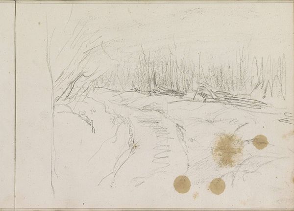 Curator: Good afternoon. Welcome. We’re standing before Jan van Essen's graphite and pencil drawing, “Landweg,” which roughly translates to “country road.” This piece is part of the Rijksmuseum's collection and is dated, broadly, between 1864 and 1936. Editor: Immediately, I feel this overwhelming quiet. You can almost hear the muted crunch of leaves and dirt beneath your feet as you walk down that lane. There's a solitude to it that's almost comforting. Curator: It’s interesting you say that, because at this period the art world was beginning to prioritize direct and unfiltered impressions of the natural world, rejecting romanticized or idealized depictions in favour of documenting the observable world. Editor: That tracks. It’s stark, unembellished. Just a raw slice of the world rendered in greyscale. But for me, that restriction actually adds to its depth. It’s forcing my eye to construct a whole world with just a handful of delicate lines. There is a lonely structure in the background, behind some forest. Curator: Yes, you pick up on something important in van Essen's rendering of light and shadow to create depth and mood. He also belonged to a movement that championed democratic access to art, moving it away from being an exclusive province of the elite. Editor: See, knowing that completely changes how I perceive it! It makes sense that the focus is the path that everyone has the right to go through it. Maybe, there is an egalitarian spirit hidden in this sketch. A simple country road, accessible to anyone, not some grandiose landscape reserved for the wealthy to admire. Curator: Precisely. What do you make of the composition itself? The trees seem to frame the road almost…dramatically. Editor: For me, it is not dramatic. The barren trees certainly contribute to the sense of solitude. But I get your point about the framing. Curator: Well, thank you. These layers of meaning really do showcase how art can invite dialogue across perspectives. Editor: And that’s where its true value lies – sparking the conversation, and stirring up the dust on that old country road!