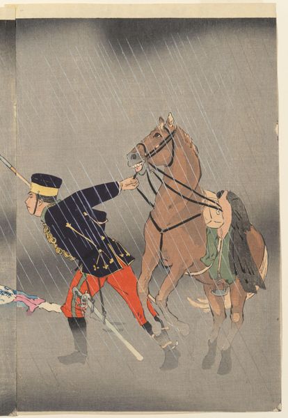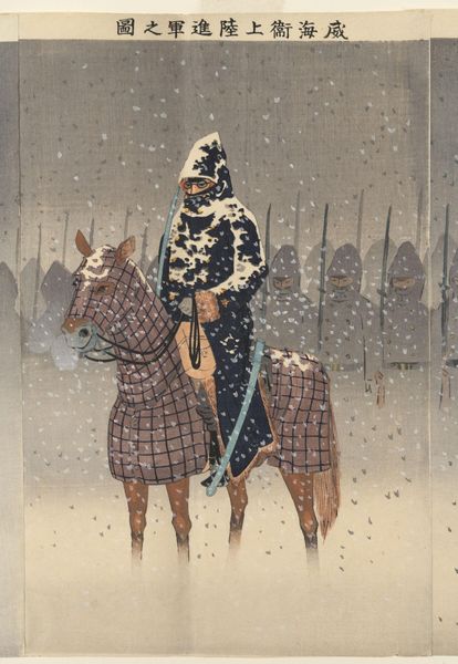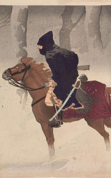 Curator: Kobayashi Kiyochika’s woodblock print, "Night Patrol in the Snow near Niu-chuang," immediately strikes me with its stark monochrome palette disrupted by the warm hues of the horses. Editor: It evokes a palpable sense of isolation and unease, doesn't it? The riders, shrouded against the snow, become almost spectral forms within that rigid landscape. Curator: Kiyochika, born in 1847, witnessed Japan's transition to modernity. Prints like these offered a sense of the changing times. Editor: The use of the triptych format, and the stark contrasts, create a sense of movement across the picture plane, almost as if the viewer is galloping along with them. The black silhouette is particularly striking. Curator: It's fascinating how Kiyochika blends traditional ukiyo-e techniques with more Western representational strategies. Editor: Indeed, considering the history, the figures could be interpreted as symbols of authority asserting control during a period of social change. Curator: I see the formal composition as more essential, but the historical context undeniably adds layers of meaning. Editor: I appreciate how exploring both form and context deepens our engagement. Curator: A balanced perspective is essential for understanding works of art. Editor: Agreed. It allows us to truly appreciate the artist’s vision and its impact.