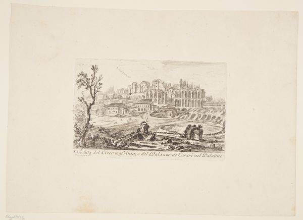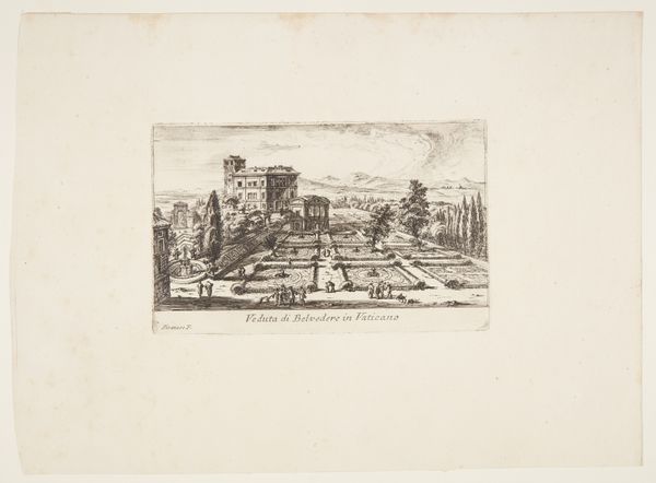 Editor: This is Giovanni Battista Piranesi's "View of the Villa Ludovisi," an etching and engraving from between 1741 and 1748. It's incredibly detailed for such a small print! I’m struck by how it showcases the grandeur of the villa, almost like a stage set. What can you tell me about it? Curator: It's interesting that you say “stage set." Piranesi’s images weren’t simple records of buildings. They actively shaped perceptions of Rome's architecture. Prints like this made the Villa Ludovisi—a private space—public. Editor: So, he's kind of democratizing access to these exclusive places through art? Curator: Exactly. He capitalizes on the burgeoning Grand Tour phenomenon. Wealthy northerners visited Italy to soak up its culture, and Piranesi fed that desire. Consider this: was he presenting an objective view or crafting an appealing image for consumption? Editor: It's hard to say! He’s clearly emphasizing the impressive scale of the villa and its gardens. It does make you wonder about the lives of the people who inhabited such spaces. Curator: And that's key. These weren't just architectural studies; they were social commentaries. Piranesi depicted the lifestyle afforded by immense wealth and power. In what ways do you think these kinds of images of grandeur served those in power? Editor: Hmm, it's a good question...Maybe the families that were subjects of his work wanted to show off, but also perhaps they believed that patronage of arts demonstrated good civic duty. Curator: Exactly. And for viewers, these prints might evoke envy, admiration, or even resentment toward the aristocracy. Prints circulated widely, fueling diverse opinions. They gave tangible form to discussions about status and hierarchy. Editor: I see. So, it’s not just about architecture; it’s about the socio-political landscape of the time. I’ll definitely look at his work differently now, considering who it was for and what impact it was meant to have. Curator: Indeed, context shifts everything. Understanding the market, the artist's intentions, and the audience's expectations deepens our appreciation. Editor: Absolutely! Thank you for highlighting that perspective.