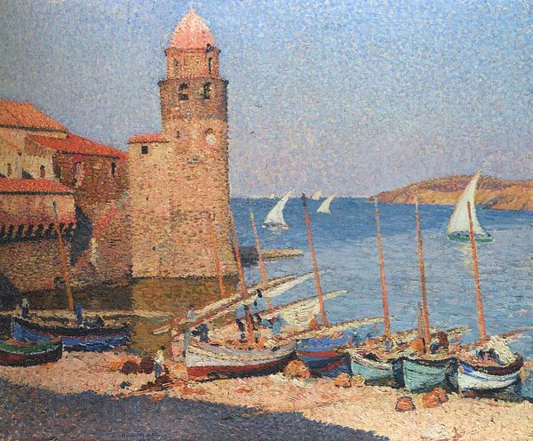 Editor: Henri Martin's "July 14 in Collioure," an oil painting, beautifully captures a cityscape bustling with life. The Impressionistic style is evident, but there is more to unpack here than mere light and color. What visual symbols or cultural memories does this work evoke for you? Curator: Notice the numerous French flags interspersed amongst the boats and buildings. These aren’t just decorations; they’re potent signifiers of national identity and collective memory, especially significant when you consider the historical context of "July 14," Bastille Day. Consider what this holiday represents: revolution, liberty, and national unity. What do these flags communicate about the culture of Collioure at the time it was painted? Editor: It suggests a strong sense of patriotism and civic pride, and perhaps a communal identity rooted in the values associated with the French Revolution? Curator: Precisely! The artist chooses to represent that collective memory, that thread of cultural continuity. This scene represents much more than a local event. What else stands out to you within that context? Editor: The boats themselves, perhaps? Their presence indicates Collioure's dependence and strong ties to maritime industries and traditions. Curator: Good. The boats signify both livelihood and connection. This becomes an illustration of community, held together by shared identity and history. Considering this, does the impressionistic style further emphasize or obscure those symbols and shared values? Editor: I think the broken brushstrokes and shimmering light enhance it, by giving an idealized vision of a shared festive atmosphere. It highlights a kind of collective unity in that specific time and place. Curator: Exactly! It invites us to remember. Seeing how visual symbols can hold layers of meaning really helps us to understand this work deeply. Editor: Yes, definitely. Now I appreciate how Martin uses imagery to really capture that collective pride.