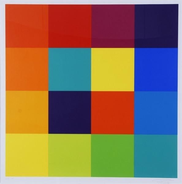 This untitled piece by Verena Loewensberg is composed of colorful bars that weave in and out of each other, creating a vibrant grid. The use of flat, unmodulated color suggests it's likely made with screen printing, a process which became increasingly popular in artmaking during the mid-20th century. Screen printing is fascinating because of its roots in commercial production; the same process used to create fine art prints was also used for posters and textiles. Look closely, and you'll see how the inherent qualities of screen printing influence the artwork's appearance. The smooth, uniform application of color emphasizes the graphic quality of the design, while the precise edges of the bars create a sense of order and clarity. Ultimately, Loewensberg’s careful use of this industrial technique underscores how materials and making carry cultural significance, blurring the lines between art, craft, and design.
