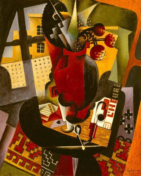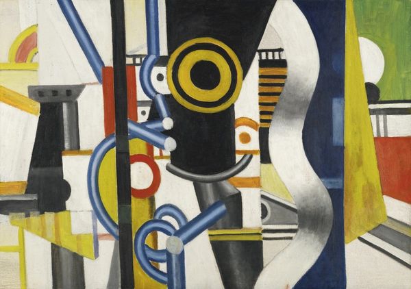 Curator: Thomas Hart Benton’s 1931 mural, "Instruments of Power," is a striking example of American Regionalism, on display here at the Met. It’s executed in oil paint. Editor: It certainly grabs your attention. I’m struck by its chaotic composition, yet each element is so meticulously rendered. There's a real tension between dynamism and rigid geometry. Curator: Benton was deeply engaged with the social and political landscape of his time. "Instruments of Power" reflects his complex views on American industrialization and progress during the interwar period. Editor: That makes sense, given the inclusion of the locomotive, the airplane, and the airship. These symbols of modernity seem almost to collide, presenting a visual metaphor for progress, but at what cost? Is there something elegiac here? Curator: Absolutely, and don’t forget the electric dynamo near the center. Benton’s work, particularly his murals, often explores the lives of working-class Americans and the impact of industry on their communities. Editor: I’m interested in the interplay between these “instruments of power” and the people who operate them. I wonder who gets to control these technological achievements and who is being affected. The silver framework layered throughout the image adds an interesting depth; it suggests looking *through* technology into other vistas, toward something both exciting and possibly catastrophic. Curator: Benton's style, with its undulating forms and vibrant colors, sought to capture the energy and dynamism of American life. But "Instruments of Power", along with his other works, received critique, some considering them to be too nationalistic or even propagandistic during a time of great social upheaval. Editor: I think, especially now, that critical tension—between hope and hazard, possibility and inequity—remains remarkably relevant. This mural is very good at sparking necessary conversations about power. Curator: Agreed. Benton compels us to confront our complicated relationship with technological advancements and their impact on society, and on labor in particular. Editor: This has offered me some new thoughts about this artist and painting, even with all its contradictions. Curator: It’s an incredibly rich piece of work that keeps offering up new interpretations. Thank you.
