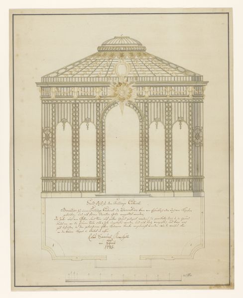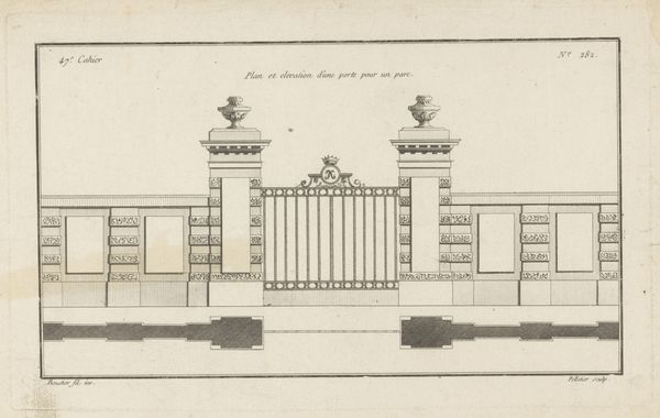 Editor: We’re looking at “Hekwerk voor een kapel,” or “Gate for a Chapel,” created between 1746 and 1782 by an anonymous artist. It's an engraving, a print, all lines and elegant geometry. It's so precise, almost feels like I’m looking at architectural plans rather than a piece of art. What strikes you when you look at this? Curator: It whispers of Neo-Classicism, doesn't it? The artist, though unknown, was clearly immersed in the return to order and reason that defined the era. What appears purely geometric to you actually hums with cultural and spiritual intent. See how the gate, despite its rigidity, also possesses a delicate balance? The artist uses line like a calligrapher, almost a meditation. What do you make of the ornamentation atop the gate, above the doorway? Editor: Now that you mention it, the details feel so deliberately placed, each shape considered. The curves offset the straight lines really beautifully. Are the embellishments symbolic, would you guess? Curator: Possibly, and that's where the fun begins! Is it simply decorative, fulfilling the aesthetic desires of the time, or does it allude to a deeper, perhaps religious narrative? It’s a game of historical detective work as much as it is art appreciation. How does knowing it’s a design for a chapel gate shift your perspective? Editor: It changes everything. Knowing its function makes me see the intention behind every choice. Curator: Exactly! It reminds us that art is so often intertwined with purpose. I wonder who ended up crafting this gate? That beautiful idea frozen in time, waiting to come alive. Editor: It makes you appreciate the craft itself, right? Knowing there’s this whole unseen process... So cool. Curator: Indeed. And it sparks that little flame of curiosity, doesn't it? To delve deeper and unlock even more of its secrets.