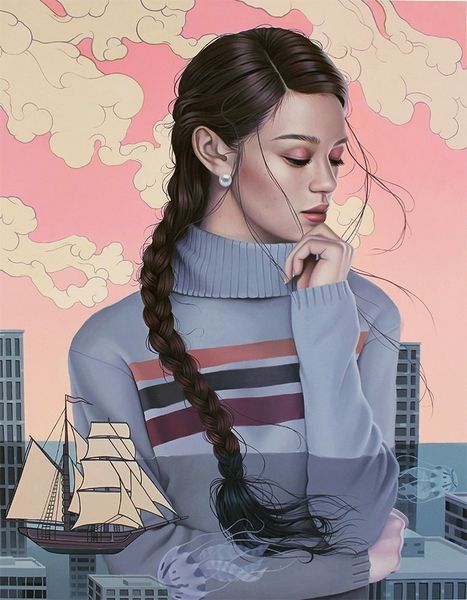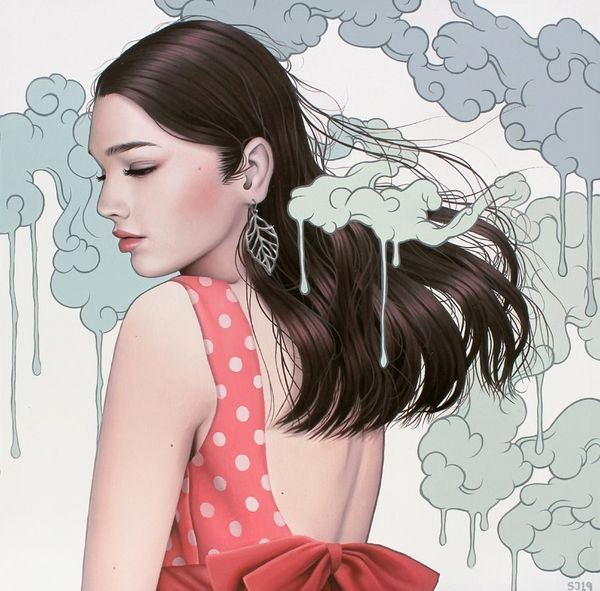 Sarah Joncas created this painting, titled "Blue Bird," using oils and acrylics on canvas. Looking closely, one can see subtle brushstrokes creating the illusion of smooth skin and flowing hair. Joncas’s attention to detail is remarkable, particularly in the depiction of the figure's tattoo; a bird pierced by an arrow. The use of traditional oil painting techniques contrasts with the contemporary subject matter: a young woman, adorned with a tattoo, set against a surreal, dreamlike backdrop. The painting engages with issues of identity, representation, and the body as a canvas. The time-intensive and labor-intensive nature of traditional oil painting imbues the work with a sense of value and craftsmanship. In a world dominated by mass production, Joncas’s "Blue Bird" celebrates the unique qualities of handmade art. This work invites us to reconsider the role of craftsmanship in contemporary art.