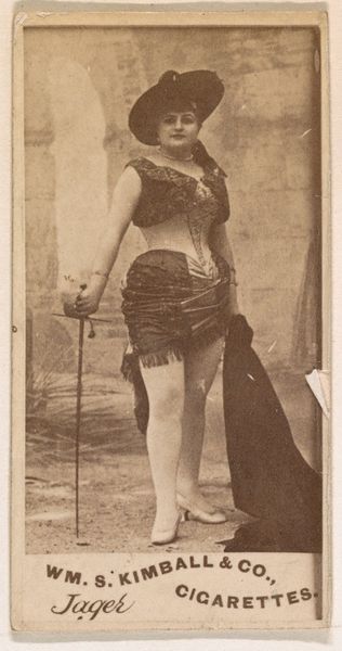 This sepia-toned photograph is part of the Actors and Actresses series created by W. Duke, Sons & Co. as promotional material for Cross Cut Cigarettes. The actress is centrally positioned, posed in costume beside a classical column, a visual motif that lends her an aura of timelessness. The photograph is striking in its use of verticality, emphasized by the tall pointed staff held by the actress. This line contrasts with the rounded forms of the column and her figure. Her theatrical attire, combined with the cigarette brand's lettering at the top, merges the worlds of performance, commerce, and classical allusion. The use of photography to create and disseminate images speaks to the rise of consumer culture. The actress becomes a sign, a brand ambassador who signifies not just artistic talent but also commodity appeal. The photograph's interplay of form and content invites us to consider how images function within cultural and economic systems.