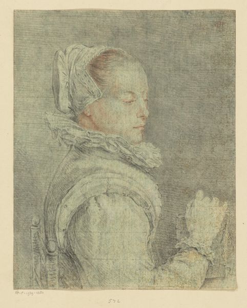 Curator: We are standing before Johannes Körnlein's "Portret van een jonge vrouw" from around 1770, a drawing currently housed in the Rijksmuseum. Editor: The immediate impression is one of subdued grace. Her downcast gaze and the somber background evoke a quiet introspection, almost melancholic. Curator: Körnlein’s piece exemplifies neoclassical portraiture, moving away from the flamboyant baroque towards a more reserved and supposedly "natural" style. It is executed using pencil and charcoal. The physical handling of these materials suggests precision, echoing the Neoclassical emphasis on clear form. Look at the almost industrial uniformity in his marks. Editor: Absolutely. That stark contrast, created through those careful marks, helps frame her in what seems like a very controlled symbolic context. The details are fascinating, from her ruffled collar and headdress—signifiers of her position. Curator: Exactly, clothing functioned as a significant marker of identity in the 18th century. Each piece carefully considered, consciously created, traded, and worn. The materiality speaks volumes about social expectations. Editor: Beyond social standing, the very act of holding what looks like a prayer book also symbolizes inner piety. These elements reinforce prevailing virtues expected of women. I find the closed book itself quite symbolic. Is it knowledge withheld, perhaps, or simply a devotional aid at rest? Curator: A very keen observation! I think there’s much to be said about that, especially during that historical period. This piece represents the way art actively codified those behavioral norms expected from those wearing high fashion. Editor: Reflecting on it now, Körnlein crafted not only a likeness but a reflection of society’s idealized, though also imposed, image. Curator: Agreed, and examining Körnlein's choice of materials gives insight into the means of manufacturing those social structures, wouldn’t you say?