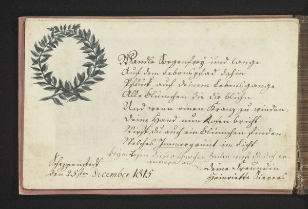 This is an undated drawing with text and two horns filled with forget-me-nots and roses, created by an anonymous artist. It exemplifies the symbolic language prevalent in early 19th-century bourgeois culture. During this period in German-speaking lands, the rise of the middle class saw an increasing emphasis on domestic life and sentimental expressions of love and friendship. Visual codes, like the flowers in this drawing, became a popular means of conveying emotion. Forget-me-nots symbolized remembrance, while roses often represented love and beauty. The cornucopias, or horns of plenty, were associated with abundance and good fortune, reinforcing the drawing's theme of heartfelt wishes. Without further historical context or artist information, our understanding of this work remains speculative. Investigating similar works within albums or friendship books of the period might reveal more about its specific social function. Ultimately, the drawing's meaning is contingent on the cultural practices and social values of its time.