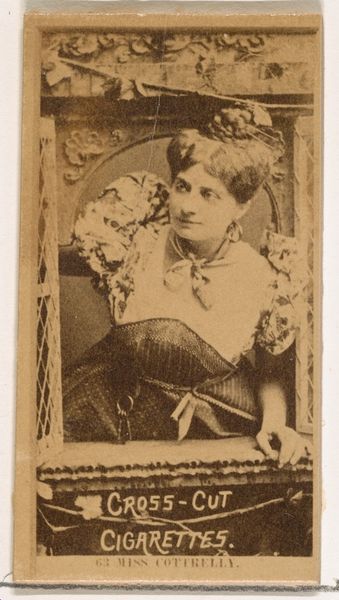 Curator: Oh, isn’t this curious? I find myself almost immediately disarmed. Something about the vulnerability of the subject, captured so plainly in sepia tones, it pulls you right in. Editor: Indeed. We’re looking at a portrait of Irene Perry, an actress from the late 19th century, specifically, sometime between 1886 and 1890. This image comes from a series called "Actors and Actresses" created by Goodwin & Company for Old Judge Cigarettes. Curator: Cigarettes, you say? That certainly shifts my perspective. It's not just a candid shot, but an advertisement. Does knowing that change my reading? A little, perhaps. Now I see it almost as performance... the performativity of beauty, commerce, even self. And her hands almost frame her, directing the eye… Editor: Exactly. Cigarette cards were immensely popular, and they played a significant role in shaping perceptions of beauty, fame, and the burgeoning entertainment industry. We must acknowledge that the consumption of images like this intertwined with larger narratives of gender and class. Consider who was smoking these cigarettes, who was given the right to have leisure, and at whose expense this supposed leisure was enjoyed. Curator: Yes, a sobering thought. Still, her eyes, there is something challenging, rebellious almost. As if to say, "I know what game you're playing." There's a quiet defiance…or am I projecting? Perhaps it’s merely the actress gazing outward in the gaze required by early photography—but somehow, there seems something beyond just sitting pretty for the lens. Editor: Well, I'm glad you said that. It reminds me that early photography has always had an aspect of resistance, a way of preserving dignity and autonomy, even for marginalized subjects. It has the capacity to immortalize figures, and immortalizing queer performers, Indigenous figures, women... it challenges a lot of traditional notions around whose image matters. Curator: So true. This little piece of ephemera suddenly feels quite weighty. The contrast is amazing, right? You know, how something designed to be tossed away now gives us insight into a time long gone… I just can't shake off this sensation that Perry had a sly intelligence about her. Editor: Precisely. Even these "minor" artifacts offer so much insight. Let's appreciate how an actress's pose on a tiny, disposable card prompts us to examine power dynamics. What begins as something cute becomes so politically relevant—it gives us a great way to understand that era!