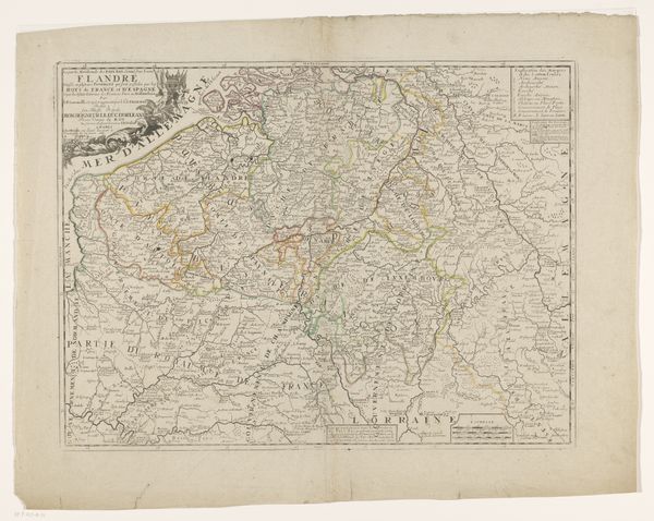 This ‘Kaart van het graafschap Namen’ or map of the county of Namur, was made anonymously and printed on paper. It would have been produced through a method known as copperplate engraving. The creation of this print involved highly skilled labor. First, the design would have been carefully incised into a copper plate. Ink was then applied, and the surface wiped clean, leaving ink only in the engraved lines. Dampened paper was then pressed against the plate, transferring the image. Finally, watercolor would have been added by hand to delineate borders and add detail. The precision and detail achieved through this printmaking process allowed for the mass production and distribution of information. Maps like this one were not simply cartographic tools, but also objects of social and political power, used to define territories, project authority, and facilitate trade. The craft of mapmaking thus intersects with broader histories of exploration, colonization, and the rise of the modern state. Understanding the materials, tools and processes used in its production, reveals its wider social significance.