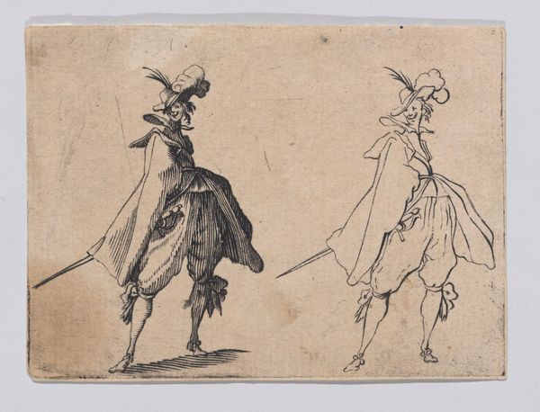 Editor: Here we have "Copy of Le Gentilhomme au Grand Manteau," a baroque etching dating sometime between 1620 and 1700, held here at the Met. The gentleman looks theatrical, but there's also a flatness to the image due to the printmaking. I wonder, what stories does this etching tell us about its time? Curator: It's fascinating how you pick up on that theatricality. Etchings like this, especially within series like "Les Caprices," weren’t just portraits; they were powerful tools for disseminating imagery and ideals. Consider the gentleman's elaborate attire. What does it tell us about social status and the intended audience for such prints? Editor: I see your point. It’s obviously meant for those who can appreciate—and afford— such fine clothing. Is it a way of displaying the socio-economic structures? Curator: Exactly. Prints allowed for a wider distribution of images previously limited to the wealthy. By understanding who was buying and circulating these images, we get insights into shifting social dynamics, emerging middle classes and the aspiration to embody courtly ideals. Does that make you think of the modern context of image dissemination? Editor: It definitely does. Think of social media and how people try to present themselves in an ideal form. But I am curious, why are there two of him? What did the original artwork this copy come from suggest? Curator: That doubling effect in this particular image enhances the performative aspect, perhaps poking fun at the affectations of nobility or simply showcasing variations in dress and style. Analyzing the "Caprices" series, one would be able to unravel specific socio-political commentary from the artist. These are pieces circulated among the elite as much as they were used as currency amongst merchants, scholars, and artists to disseminate these images in broader contexts, and to make them accessible to broader audiences than simply elite classes. Editor: That is insightful. Seeing the cultural relevance of the print medium and the social commentary that they provide reshapes how I see not just this piece, but portraiture of the era more broadly. Curator: Precisely! Now consider how museums, like the Met, play a role in shaping our understanding of these historical dialogues by preserving and presenting them.