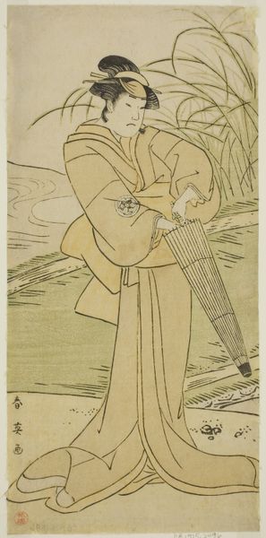 Curator: The unsettlingly theatrical figure before us is featured in Katsukawa Shun’ei's color woodblock print, made around 1791. We're seeing The Actor Onoe Matsusuke I as the Ghost of Ki no Natora. It depicts a scene from the play *Kiku no En Mukashi no Miyako*, which translates to something like "Chrysanthemum Bond in the Ancient Capital". Editor: It’s instantly unnerving, yet captivating. The pale skin, that near-smile frozen on its face. It feels like a spirit trapped between worlds. Is that large golden robe a clue about his status? Curator: That’s precisely the right instinct. The yellow garment carries potent symbolic meaning. Yellow and gold, associated with royalty and divinity, served as potent cultural shorthand in Edo-period Japan. Consider the societal context – theater actors, while beloved, occupied a lower rung in the social hierarchy. Here, Onoe Matsusuke, playing a vengeful spirit, is literally elevated through costume. Editor: And visually amplified through Shun’ei's bold composition! The monochrome background really pushes the figure forward. The sharp black outlines contribute to the sense of unease. What strikes me most is that it feels like a subversion, an actor embodying something sacred and terrifying, maybe testing those very boundaries in society. Curator: You're touching on crucial elements. *Ukiyo-e* prints were central to Edo period urban culture – relatively affordable artworks circulated amongst the burgeoning middle class. Kabuki theatre, then, wasn’t merely entertainment; it served as a crucial vehicle for commentary. And as for his character, Ki no Natora— well, he died unjustly. Editor: The enduring fascination with ghosts and spirits speaks volumes, doesn't it? In a world of strict social codes and hierarchies, the ghostly realm offered a space to explore transgression. What stories were whispered beyond those paper walls? Curator: Precisely. Art provided a space for psychological release and societal reflection. What began as theater made its way into everyday homes. The ghost's presence, made palpable in print, made the cultural tensions just as inescapable. Editor: Looking closer now, I find myself wondering what kind of conversations and debates prints like this sparked across Japan, not just within the sophisticated circles of Edo, but within homes too. Curator: And that, I believe, is where its enduring value truly lies.