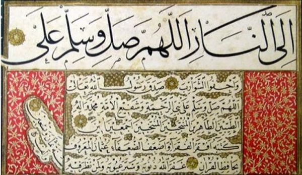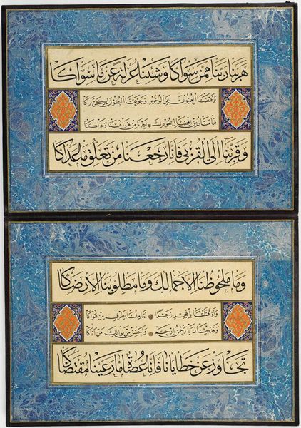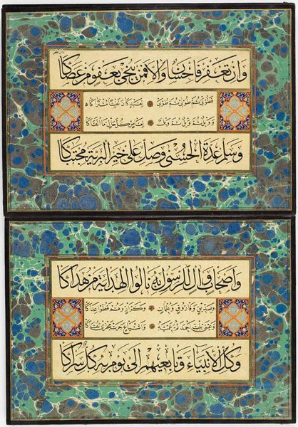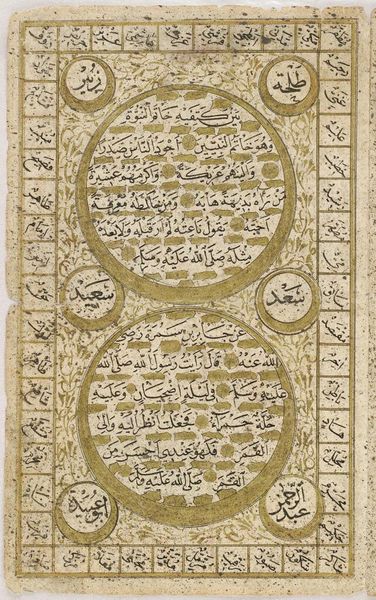 Curator: We are looking at "Levha - Hadis-i Şerif," a textile piece with calligraphy, likely Ottoman, although it lacks a precise date. It’s a compelling example of Islamic decorative arts, don't you think? Editor: Absolutely! The intricate details and geometric patterns are striking, creating a mesmerizing visual effect. What I find particularly interesting is how calligraphy becomes the primary form of artistic expression here. What stands out to you in this piece? Curator: I'm immediately drawn to how this work served, and continues to serve, a devotional function. Islamic calligraphy is never *just* decorative. The careful rendering, the placement of specific texts, all point to a didactic and spiritual purpose. Who had access to view and interpret such a piece and what message did it impart in its time and context? Editor: That's a great point. Considering its historical context, the intended audience would likely have been educated elites within Ottoman society who were fluent in Arabic and possessed a deep understanding of Islamic teachings. But did the artistic expression or materials themselves, outside of the linguistic content, have social implications as well? Curator: Yes, certainly! Textiles, especially finely worked ones like this, held social and economic significance. They were markers of status, often commissioned by wealthy patrons or institutions. Think about where something like this might be displayed – a mosque, a palace, a wealthy home. Its visibility was certainly tied to social structures. Also consider, in a society with varying literacy levels, the visual power of calligraphy extended beyond simply reading the text; it was about seeing and revering the divine word made manifest through art. Editor: So, its significance transcends mere aesthetics. This piece blends artistry and cultural values to represent an epoch of strong beliefs and structured social hierarchies. That's helpful to keep in mind! Curator: Precisely. Examining such objects through a historical lens helps us unpack their multi-layered meanings and understand how art actively participates in shaping cultural narratives. Editor: I'll remember that in the future! Thanks for providing all the food for thought!