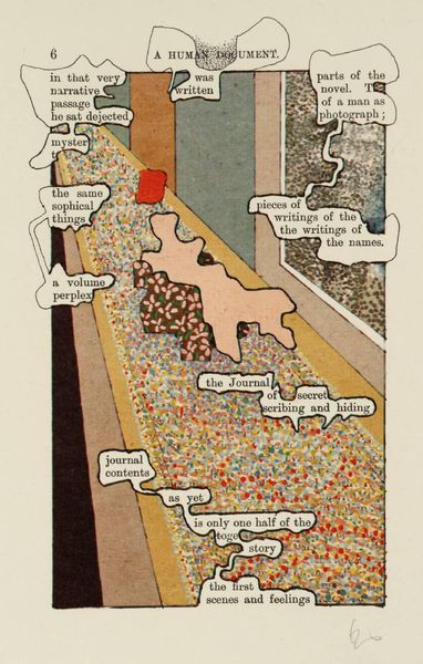 Editor: This is an intriguing mixed media piece by Esq Tom Phillips. The collage-like format, with text scattered across a pastoral scene, creates a rather disjointed impression. What do you see in the way Phillips uses text and image here? Curator: The piece presents a fascinating interplay between textual and visual elements. Note how the artist utilizes the formal qualities of each—the texture of the printed words, the arrangement of phrases, contrasting with the drawn landscape. Consider how the artist constructs meaning through this juxtaposition. Editor: So, the meaning arises from how he puts these different components together? Curator: Precisely. The piece invites us to decode the relationship between text and image, considering how the artist's formal choices shape our interpretation. Editor: That's really interesting, thanks. I'll definitely look closer at the different textures and patterns. Curator: Indeed, paying attention to those structural elements can unlock new insights.