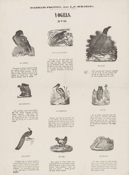 This print, made by erven weduwe Cornelis Stichter, depicts a variety of animals and plants. Though undated, its visual style, combined with the imprint in the bottom margin, suggests it originates from the late 18th century in Amsterdam. Prints like these reveal a culture of scientific curiosity and a desire to classify and understand the natural world. The chosen species reflect the expanding horizons of the Dutch Republic. As a major trading power, the Dutch had access to exotic flora and fauna from around the globe. This print provided a way for people to learn about these newly discovered species. It served an educational purpose, reflecting the Enlightenment’s emphasis on reason and empirical observation. These types of prints were often sold as part of larger encyclopedic collections, reflecting the institutionalization of knowledge during this period. Studying prints like this one help us understand the intersection of art, science, and commerce in the Dutch Republic. Catalogues, trade records, and scientific publications are all useful resources for developing this understanding.