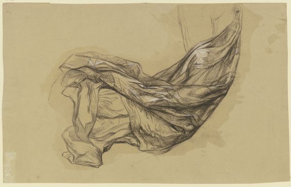 Editor: So this is Elihu Vedder's "Study for 'Greek Girls Bathing,'" from around 1872. It’s a pencil drawing on paper, and the first thing that strikes me is how dynamic the drapery is, it looks almost windswept. What can you tell me about this piece? Curator: It's fascinating how a study of drapery can be so evocative. Vedder was part of the American expatriate art scene in Rome, grappling with classical themes in a rapidly changing world. This study, while seemingly just about form, raises questions about representation. Editor: Representation of what, exactly? Curator: Think about the title, "Greek Girls Bathing". Who gets to represent these women? Vedder, as a white male artist, is interpreting a scene rooted in antiquity, likely through a lens that reinforces certain power dynamics. What do you make of the way the artist captures the female figure, which is implied here, concealed beneath the drapery? Is it respectful, or does it contribute to the objectification of women, common in the male gaze in art of that time? Editor: I see your point. The figure is almost absent, existing only as a shape *under* the fabric. That feels... exploitative, in a way. Curator: Exactly. And it prompts us to question the context around Vedder's work. Was he intentionally engaging with the discourse of his time? Or simply perpetuating existing norms? We can consider, too, the societal constraints placed on women artists during this era and the limited opportunities they had to depict themselves, or other women, authentically. Editor: That's a powerful way to look at what I initially just saw as a simple drapery study. It definitely adds layers of complexity to the image and makes you think about the artist's perspective and who he's really representing. Curator: Precisely. It highlights how even seemingly benign works can reveal uncomfortable truths about history and representation and gender politics.
