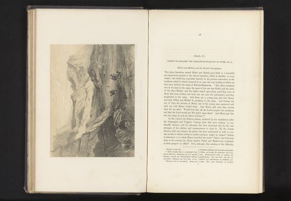 Editor: Here we have an engraving entitled "Gezicht op de Serbalberg of de Sinaïberg," or "View of Mount Serbal or Mount Sinai," made by Day & Co. before 1862. The stark contrasts of the mountainscape create a really dramatic, almost unsettling mood. What formal elements stand out to you in this print? Curator: Indeed. The dramatic effect relies significantly on the interplay between light and shadow. Notice how the engraver meticulously used varied line weights to model the rugged terrain of the mountain range, thus creating a sense of depth and volume. Furthermore, observe the balanced composition, divided into distinct foreground, middle ground and background. Is it not this calculated arrangement which leads our eye through the pictorial space, carefully directing attention? Editor: Yes, I see it. The textures achieved through the engraving also add a tactile quality despite being a print. Curator: Precisely! The textural variance—achieved through hatching, cross-hatching, and stippling—not only describes the physical form of the mountains and foliage but also evokes their materiality. Consider the density of lines in the darker areas versus the relative sparsity in the lighter areas; this dictates the visual rhythm. Doesn't it cause a sensory engagement that transcends simple representation? Editor: That makes me think about how modern printing techniques might achieve this differently, perhaps more smoothly. Curator: That comparison highlights how an engraving privileges line and tonal gradation built through meticulous labor. Mass production techniques prioritize efficiency, but potentially compromise nuanced sensory engagement with material. The strategic manipulation of the medium, not just the depiction, is critical to meaning. Editor: Thinking about the contrast between light and shadow, and those deliberate choices with the material really illuminates the formal qualities at work. Curator: Precisely. Engaging the materiality heightens perception.