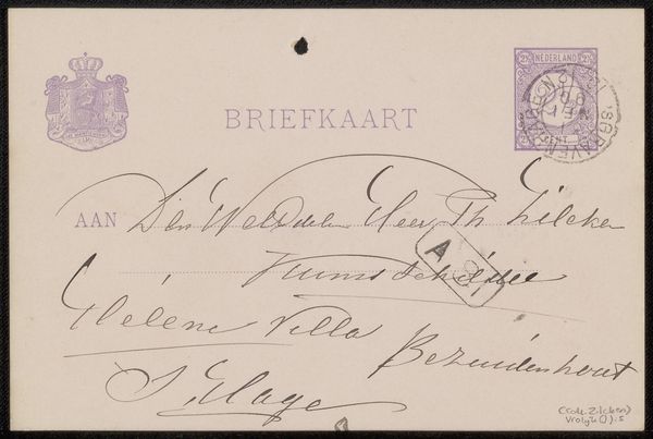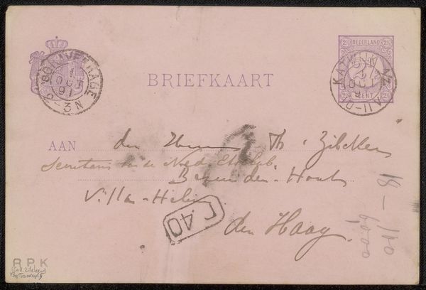 Curator: This postcard, addressed to Jan Veth, comes from the hand of George Hendrik Breitner. While undated, its postmark places it before 1892. It’s done in ink, pen and print. Editor: My first impression is one of intimacy. It feels like glimpsing a fleeting connection between artists across time, rendered in fragile, faded ink. The visual density of the layered script is really remarkable. Curator: Indeed, the script is fascinating. Note the various calligraphic flourishes, and how Breitner uses different weights of line to structure the address. Semiotically, the cancellations speak to process and temporality. Editor: And to power structures, doesn't it? I mean, here we have this visual manifestation of communication, but controlled by these almost imperceptible rules and systems...the postal service's implicit social contract. And the physical vulnerability of a missive containing such sensitive information... Curator: While I appreciate your socio-political reading, I’m drawn to the aesthetic economy here. The artist distills communication to its absolute visual essence: direction, designation, and signature. A marvel of economy. Editor: But it's also interesting how seemingly inconsequential correspondence becomes an object of study, right? This scrap that perhaps was never intended for anything beyond delivering a message now finds itself in a museum. Whose stories are we archiving? Why *this* postcard? Curator: From a formalist perspective, its journey underscores the evolving context that alters inherent artistic value. The intersection of Breitner’s hand and the banality of postal communication elevates the commonplace. Editor: Precisely, so perhaps the deeper message isn’t about form but the layered narrative it represents. What seems insignificant is always reflective of cultural paradigms. The study of ephemera can expose powerful sociopolitical forces. Curator: I can agree that tracing the lineage from postal artefact to valued document opens fascinating analytical paths. It certainly deepens my understanding of Breitner’s artistic ecosystem. Editor: And for me, it illuminates how history shapes not just the art, but our view of it. We bring new social context to interpret it again, and again.