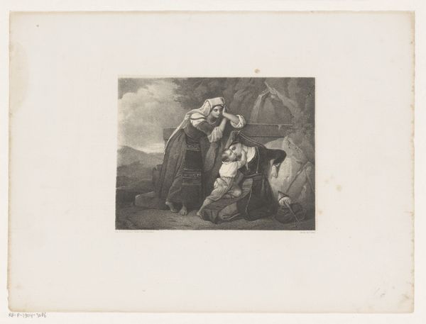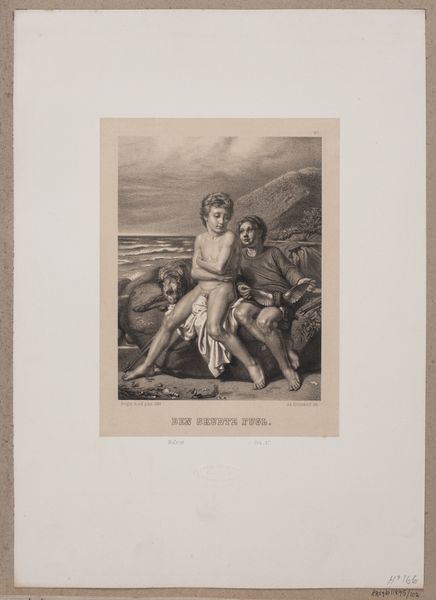 Editor: Here we have Adolph Kittendorff's lithograph from the 1880s, called "Italienrinder" which, judging from the title and the Italian landscape, must be about Italian cattle... although, seeing these women, it looks more like "Italian Children"! There’s a tranquil domesticity to the scene. What do you see in this piece, beyond the obvious motherhood theme? Curator: Well, beyond the Madonna-esque composition with mother and child, it sparks a certain curiosity in me, a whisper of storytelling, if you will. Look at the second woman, perched on her knees, playfully trying to get the baby's attention. Perhaps this is simply a genre painting, capturing an everyday moment, or maybe there is more history embedded in those rocky shores, and perhaps some playful exchange of motherhood wisdom. What is your first reading of her gesture? Editor: That's a really lovely reading! At first glance I perceived that other woman as simply fetching water or something, assisting the mother. But there is definitely a teasing element there too...I am suddenly seeing so much joy and vitality! Perhaps I was just thrown off by the muted color palette and didn't notice it! Curator: Isn't it funny how a monochrome palette can almost mute joy for us, huh? Yet this piece seems to subtly explode with life. So often these seemingly simple domestic scenes reveal far more complex emotional textures. Next time you're near a print, spend time to notice subtle hints of history behind that joy, and let the monochrome play with you, instead of against. Editor: I will. Thanks for showing me how much I could get from this simple domestic scene! Curator: My pleasure. Every artwork, you see, is like a poem, needing patient eyes to unwrap each gift.