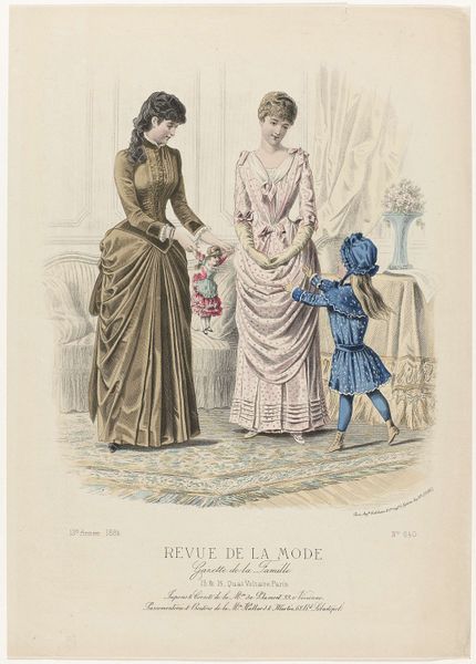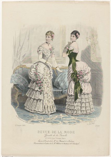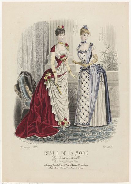 This print, from the Revue de la Mode, Gazette de la Famille, dated October 18th, 1885, presents a study in sartorial structure through the depiction of three distinct dresses. Each figure stands rigid, displaying an explicit engagement with form, with specific attention to the period's emphasis on shape and silhouette. The central wedding dress is a cascade of vertical pleats with a focus on the construction of the bodice and the fall of the fabric. The dress to the left opposes this with horizontal ruching, tied together by a large burgundy bow. The dress to the right has a layered skirt with lace detailing. Each dress is a sign, a symbol of its wearer's position. As a piece of structural communication, this print presents a semiotic system of signs; the cut of a dress and the materials used tell us of the wearer's aspirations, beliefs, and relationship with the social mores of the late nineteenth century. The piece invites us to consider fashion not just as adornment, but as a visual language ripe with cultural meaning.