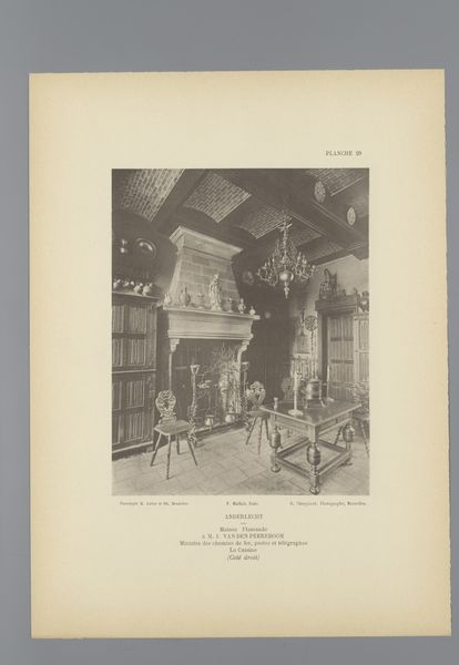 Editor: Here we have an image titled "Gezicht op de eetzaal in renaissancestijl in het huis van M. van Roye in Brussel, België," which translates to "View of the Renaissance-style dining room in the house of M. van Roye in Brussels, Belgium." It was created before 1898 by G. Choppinet and exists as a print. I find the room strangely sparse for how ornate it is. What stands out to you? Curator: It speaks to the enduring power of Renaissance ideals. Even captured through a photograph, turned into a print, there's an assertion of cultural memory. Consider how the room itself, filled with classically-inspired motifs, strives to evoke a specific era and its associated values. Do you see how the light fixture carries emotional weight and echoes earlier traditions? Editor: Yes, the chandelier does look quite grand. Is there something particular about the choice of Renaissance style in a Belgian home of that period? Curator: Indeed. Think about what the Renaissance represents: rebirth, humanism, a connection to classical antiquity. By adopting this style, the homeowner, M. van Roye, likely wished to associate himself and his home with these ideals of intellectualism and refined taste. What statement is he making by choosing this symbolic language for his domestic space? Editor: Perhaps he wanted to show that he valued those classic ideals. Like decorating with ancient virtue. Curator: Precisely! The choice isn't merely aesthetic; it’s a carefully constructed narrative. The dining room, a place of gathering and sustenance, becomes a stage for projecting a particular identity steeped in historical consciousness. Food becomes discourse, and the meal is an occasion to project one’s intellectual status and good taste. Editor: I see! So it's not just about looking pretty; it's about what the space communicates about its owner. Curator: Exactly. The imagery and design serve as a powerful statement about identity, aspirations, and cultural belonging. Editor: That’s fascinating. I'll definitely look at interiors in a different light now. Thanks for your insight.
