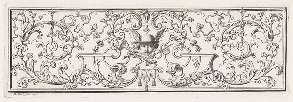 Editor: This is "Ornament met een gezicht met muts," an engraving by Bernard Picart from 1723. It's a decorative piece, incredibly detailed, with a face in a helmet right in the center. It almost feels like a crest or a royal emblem. What can you tell me about the symbolism in this work? Curator: Indeed. Ornament, as you said, immediately brings heraldry to mind. The face itself, framed by foliage and topped with that rather flamboyant headdress, pulls our eye. But consider, what does the repetitive, symmetrical arrangement suggest to you? The mirroring birds, foliage, the very balanced composition? Editor: Maybe order, like everything is controlled and in its place? Curator: Precisely. The controlled exuberance is classic Baroque. It's designed to impress with detail but within very defined rules. It communicates power and refinement. What do you think the face represents within that system? Editor: Hmmm, I guess it's more than just a decorative element. Being in the center, maybe it's meant to be a portrait, like the emblem of a specific person? Curator: Possibly, though it might also be an idealized representation. What are the clues that the engraver gives us about this figure’s persona? Editor: The helmet maybe gives the sense of military valor, or power, the leaves might imply a more symbolic significance. Curator: The helmet definitely suggests authority, and the surrounding foliage hints at peace or victory. Think about the era: decorative arts weren't just about aesthetics. They broadcasted messages. Through carefully chosen imagery, they communicated lineage, status, and aspirations. The image becomes almost talismanic. Editor: So, it’s a whole language hidden in plain sight! Curator: Exactly. Cultural memory embedded in image. These choices speak volumes about cultural values and aspirations. Editor: It makes me see decorative arts in a completely different way now! It's more complex than I initially thought.