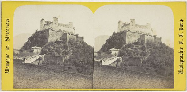 Editor: This is "Ruines van de Burcht Ehrenfels bij Rüdesheim, Duitsland," or "Ruins of the Ehrenfels Castle near Rüdesheim, Germany," taken by Hippolyte Jouvin between 1860 and 1870. It’s an albumen print – quite a popular medium for landscapes then. I find the castle ruins somewhat melancholic. What strikes you most about this image? Curator: What’s striking is less the romantic ruin itself, but the *making* of this image, the materiality of the print. Albumen, derived from egg whites, speaks volumes about labor. Consider the scale of albumen production needed for widespread photography – chickens, eggs, factories processing them… it's an industrialized landscape hidden within this picturesque scene. What does this reveal about the economics behind landscape photography, its consumption as a commodity? Editor: That's fascinating, I hadn't considered the process itself! The egg whites... it sounds like an incredible amount of labor. Curator: Exactly! And beyond labor, there's the colonial context. Where did this albumen *come* from? Were there exploitative supply chains involved? Early photography often relies on resources extracted globally, obscuring its participation in a wider, unequal world system. Editor: So the image becomes less about the German landscape and more about a globalized network of resources and labour? Curator: Precisely. While seemingly documenting a scene, the photograph is itself embedded in circuits of production and consumption. Even the chemical processes required – silver nitrate, etcetera – have histories tied to industrial extraction and exploitation. Editor: This really changes how I view the image, thinking about what's 'behind' the print. Thank you. Curator: And it changes how we view art history itself, not just as a succession of images, but as a history of materials and the often-hidden labor that produces them.