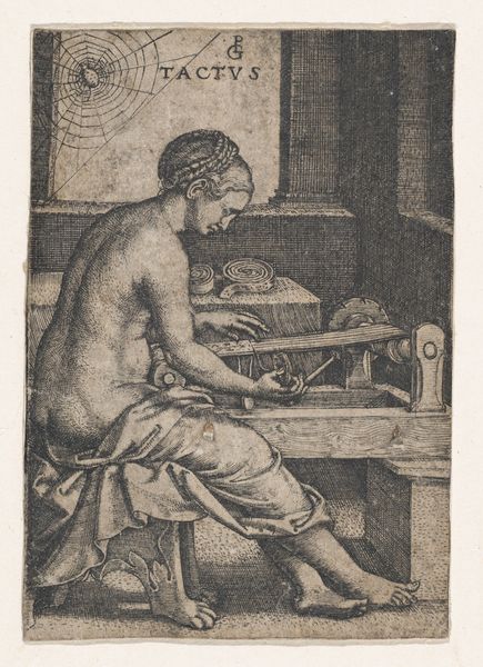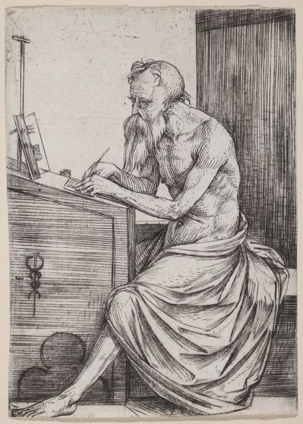 Jacopo de' Barbari created this engraving of Saint Jerome sometime between 1497 and 1516. During this period, representing the human body was very important, but it was often idealized. Here, Saint Jerome is depicted as an old, frail man, seated at his desk, deeply absorbed in his work. His aged, almost emaciated body, draped in simple cloth, speaks to a life dedicated to scholarship and religious devotion, rather than physical pursuits. Note the placement of the caduceus, an ancient symbol often associated with medicine, near Jerome, who translated the bible. This rendering may reflect a deeper commentary on the values of the Renaissance, one that honors intellectual and spiritual labor over youth and beauty. Barbari invites us to find beauty and significance in the wisdom and experience etched onto Jerome's body. He presents an alternative narrative, one where aging and knowledge are sources of profound value.