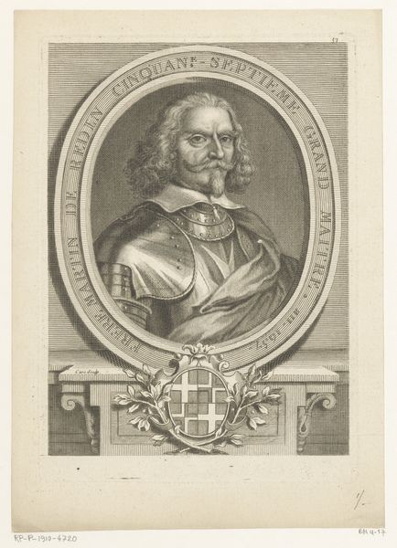 Curator: This engraving, created by Joannes Meyssens between 1640 and 1670, depicts the "Portret van Filips graaf van Hohenlohe." It’s held in the collection of the Rijksmuseum. Editor: Immediately, the steely gaze of the subject strikes me. The level of detail, particularly in the ruff and armor, suggests a desire to convey power, though there is also vulnerability hinted at in his expression. Curator: Absolutely. Consider the socio-political climate in which this portrait was produced. The Count of Hohenlohe was a prominent military figure. Prints like this served to circulate his image, reinforcing his authority within the Dutch Republic, which was still solidifying its independence during the Eighty Years' War. The setting and emblems create this aura. Editor: And that frame, packed with detail! Those cherubic figures almost feel like spectators flanking a stage, peering out as the narrative of leadership is carefully constructed through symbolism and posture. I also like the frame including weapons as symbol of power Curator: Indeed, it's no accident that he’s adorned in full armor. Meyssens shrewdly employed printmaking, in order to connect noble leaders with the rising political ambitions. This engraving becomes an object that participated actively within power struggles. Editor: I wonder how the portrait was actually received, both by Hohenlohe himself and by those who viewed it. Was this a representation he embraced, or was there any friction between the artist’s portrayal and Hohenlohe’s own self-image? It really encapsulates how portraiture operates in a dance between power, representation, and social perception. Curator: It's an essential consideration, isn't it? The public reception of such images would certainly influence both Meyssens’ subsequent commissions and the visual language used in other portraits of the period. Furthermore, what about the people unable to afford such prints? Editor: Precisely, it sparks a broader discussion about visual representation in leadership during conflict! Considering its political implications has changed my first impressions, especially thinking about who has access to these images and stories. Curator: I completely agree. Analyzing how artistic representations shape the public's image is essential. Editor: A worthwhile endeavor indeed!
