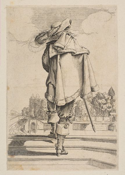 Curator: This drawing, "Man, gekleed volgens de mode van omstreeks 1630, met stok in de hand," created around 1630 by Pieter Nolpe, offers a glimpse into the attire and perhaps the social standing of a man during the Dutch Golden Age. It is made using ink on paper and resides here at the Rijksmuseum. Editor: My immediate reaction is how self-assured he looks! He is just so stylish and really seems to exude confidence. There's a looseness to the drawing style too, as if the artist captured a fleeting impression. Curator: Precisely. The very fashion he embodies reflects a specific socio-political moment. Clothing in the 17th century was a clear indicator of status. This figure's elaborate ruff, wide-brimmed hat, and the cut of his jacket signify a certain level of affluence, potentially connected to the rising merchant class or those affiliated with military service. Editor: I’m drawn to the execution of the clothing. The way the ink defines the pleats of his breeches and the textures of the fabric invites thoughts on the labour and craftsmanship involved in producing such garments. The quality of materials denotes status but also speaks to wider systems of production and trade. Curator: A crucial element. Nolpe, known for genre paintings and prints depicting scenes from everyday life, frequently embedded subtle social commentary. His portrayal aligns with art historical precedents from that era regarding dress. The use of ink also offers the opportunity to address questions of printmaking and access. Consider the social implications of art making accessible. Editor: And it also captures an intriguing dynamic in materiality. There's the immediate act of the artist applying ink to paper, capturing a sense of life through lines, juxtaposed with his detailed focus on the production of textiles to replicate high fashion trends of the time. Each informs the other. Curator: A valuable link. Nolpe invites us to analyze his world—how dress informed status and shaped the lived experiences of those he represents. He opens a dialogue on questions of representation in the midst of Dutch Golden Age painting. Editor: Indeed. The interplay of representation, material culture, and social dynamics captured here gives insight into this formative period. Curator: Precisely, a moment to reflect on access and materiality. Editor: Absolutely, seeing how creation and context meld together in a small work on paper is pretty insightful.