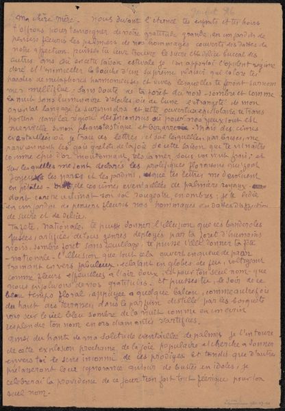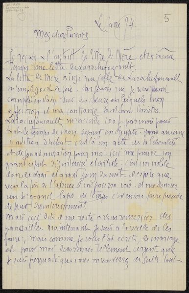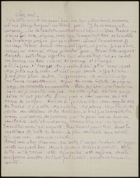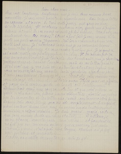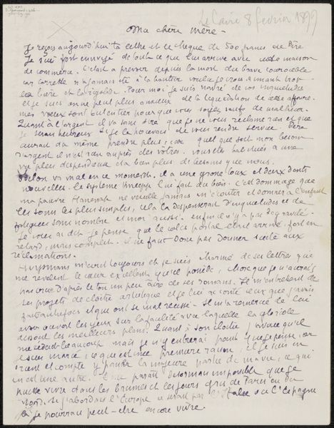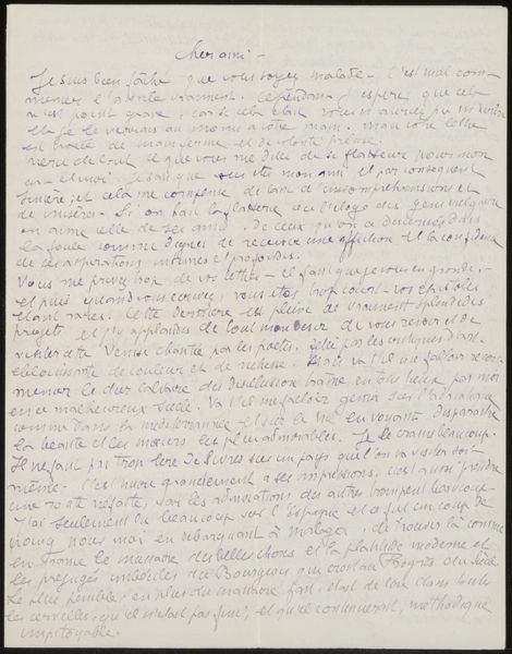 Curator: Today we’re looking at "Brief aan Andries Bonger," a drawing by Émile Bernard created before 1898. It’s composed of ink on paper. I’m always struck by the intimacy of artists' personal correspondence. Editor: It has a dreamy quality... It reminds me of reading someone else's diary or stumbling upon a half-forgotten memory. The handwriting itself, so close together, feels like it's holding secrets, whispering them just loud enough for you to try and decipher. Curator: Yes, the script gives the whole piece an incredible density, don't you think? The composition is entirely consumed by it, save for some modest margins. We know from the letter itself that the artist corresponds with Andries Bonger on his immediate departure for the Netherlands. Editor: Absolutely. I wonder what his state of mind was like as he penned these words? The way the writing seems to cascade down the page almost evokes a feeling of anxious energy. Was he rushing, or simply carried away by his thoughts? The act of putting pen to paper in this way, allowing thoughts to spill forth—it feels unfiltered, almost primal. Curator: Consider also the symbolic nature of letter-writing. Letters are never quite the same as face-to-face conversation, are they? They allow a person to compose their thoughts in a more structured manner while at the same time acting as a vehicle of genuine sentiments. Letters act as tokens, physical reminders, bridges across time and distance, containing words but also emotion. Editor: It’s a fragile means of connection in this sense—one that speaks to something fundamentally human, this desire to reach out, to share, to connect. This need persists across generations. Looking at this drawing really sparks an urge to put pen to paper myself! There is an unmistakable magic to analogue forms of correspondence that seems more poignant now than ever. Curator: A lovely sentiment, and an insight perfectly pitched to the affective qualities of Bernard's sketch. It speaks to how art and visual materials allow for continued connection through a cultural transmission of forms and affects. Editor: I'm so grateful we got the chance to dive into these deeply felt, deeply symbolic gestures today!