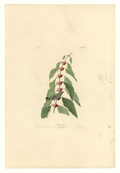 Editor: This is "Plate 5. Bonaparte's Flycatcher" by John James Audubon, rendered in watercolor and drawing on paper. It's interesting how the bird is so small compared to the leaves and the dense red flower, almost swallowed by the plant's forms. What jumps out at you in terms of the image's composition? Curator: The most striking aspect from a formalist perspective is the strategic arrangement of forms. Notice the asymmetrical balance, how the weight of the reddish blossom at the top is visually counteracted by the spread of foliage and the bird’s positioning. The artist employs a sophisticated interplay between positive and negative space, the blank background emphasizing the density of the plant. Do you see how the light catches certain leaves, creating a visual rhythm? Editor: I see it now, the light definitely guides the eye. And it's like a dance between the smooth, almost sculptural leaves and the much more detailed flower. Is the contrast intentional? Curator: Undoubtedly. The artist is deliberately playing with texture and detail to create visual interest. Consider the smooth gradient of color on the leaves versus the tight clustering and detailed rendering of the individual florets. It is through these oppositions—smooth/rough, light/shadow, empty/full—that the image obtains its dynamic visual structure. The paper itself appears to have a slight tone to it, adding a warmth to the image as a whole. The artist creates an internal visual logic. Editor: It’s amazing how much can be said just by looking at the elements themselves! Thanks. I'll definitely pay closer attention to composition in the future. Curator: Indeed. Understanding an image’s construction deepens one’s understanding of its effect. We build a more nuanced reading of what that image conveys through line, shape, and color relationships.