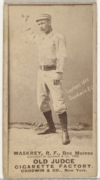 This is a baseball card of William C. Crossley, a catcher for Milwaukee, made in 1889 by Goodwin & Company for their Old Judge Cigarettes. The card is a photographic print, mass-produced for insertion into cigarette packs, reflecting the burgeoning popularity of baseball and tobacco in late 19th-century America. Consider the Old Judge series within the context of industrial capitalism and the rise of consumer culture. Cigarette companies were eager to associate their products with the wholesome image of sports heroes. The visual codes here are interesting. Crossley is shown in action, yet the backdrop is a studio, blurring the line between performance and advertisement. To fully understand this image, research into the history of baseball, advertising, and the tobacco industry is invaluable. Only then can we appreciate the complex interplay of commerce, sport, and cultural values embedded in this seemingly simple baseball card.