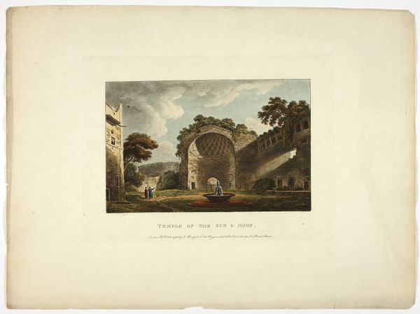 Editor: Here we have "The Temple of Peace, plate nine from the Ruins of Rome," created around 1796 by M. Dubourg. It’s a watercolor and etching printed on paper. I’m struck by how this rendering of classical ruins becomes a picturesque scene with everyday people and animals populating it. What does this piece say to you? Curator: This print offers a fascinating glimpse into the consumption of classical antiquity in the late 18th century. It's not just a depiction of ruins; it’s an artifact in itself. How was this image produced and for what purpose? Prints like these were commodities, made through skilled labor, consumed by those who perhaps could not visit Rome themselves. Editor: So it’s less about the artistic vision, and more about the means of distribution? Curator: Precisely! The etching process, the type of paper used, the watercoloring – all speak to the mechanics of producing and disseminating images. Dubourg isn't just recording the ruins; he's participating in the marketplace of ideas and aesthetics. Think about the social context: who could afford these prints, and what did owning them signify about their social status and taste? Editor: That definitely shifts my perspective. It's not just a romantic landscape; it's a manufactured object with its own history. So even the Romanticism on display is tied to consumption. Curator: Exactly. Consider also that Dubourg has roots in France. Here the traditional academic approach merges with labor intensive reproduction method. The material conditions surrounding its creation shapes what it communicates, more than simply 'beauty' or historical accuracy. What are your final thoughts? Editor: It really highlights how art isn't created in a vacuum. Seeing it as a manufactured product opens up so many questions about its role in society. Thanks, I learned so much!