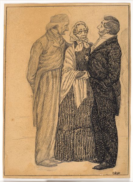 Editor: We are looking at "Pierre Copies the Virgin from the Portal of the Church of Marly," an engraving by Paul-Albert Besnard, created around 1885. There's such a fascinating layering of figures, a sort of glimpse into a scene. What’s your perspective on this work? Curator: From a materialist viewpoint, this piece provokes questions about the labor embedded within it. Besnard, as the artist, directly interacts with a representation – the Virgin – that already carries immense cultural weight. What is replicated and what's reinterpreted? Editor: Right! I didn't even think about that at first glance! How the copy itself adds another layer... Curator: Exactly. The act of “copying” shifts the artwork's position. Besnard isn't just replicating; he's actively participating in the dissemination and therefore transformation of religious iconography for potential mass consumption. He's using printmaking – a readily reproducible medium – for this purpose. Do you see how that contrasts with, say, a unique sculpture of the Virgin? Editor: I do! It's no longer just about religious devotion, but about the mechanics of how images are circulated and consumed. And this scene feels almost staged, with people sitting like an audience, while someone stands to our left, separating us as the viewer from the "action" occurring behind them. Curator: Precisely. The "staging" further underscores the active roles within this seemingly simple "copying" scenario, don't you think? From a production standpoint, this brings forth considerations of labor – from Besnard's own engraving work, the potential printing and distribution processes. Each action inflects a new value onto this icon, while testing established notions about authenticity. Editor: It’s fascinating how considering the materials and production transforms what seems like a simple depiction of an artist at work. I feel like I'm now seeing this as a whole chain of labor and reproduction, not a portrait. Curator: Exactly. That shift is key. We move beyond simply appreciating the "image" and delve into the intricate socio-economic structures inherent to its making.