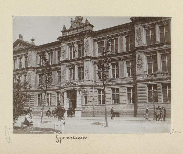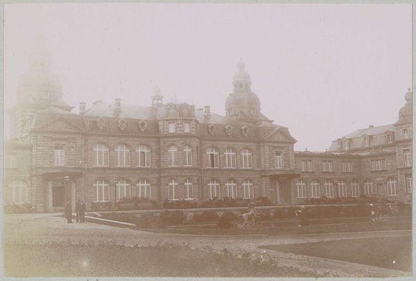 Curator: A certain stillness hangs over this old photograph. I feel drawn into the past, almost like a voyeur peeking through time itself. Editor: Indeed. We're looking at "Gevels aan de binnenplaats van Slot Johannisburg in Aschaffenburg," which translates to "Facades in the courtyard of Johannisburg Castle in Aschaffenburg." The photographer, whose name is unknown, captured this monochrome print around 1900, and it now resides in the Rijksmuseum collection. Curator: The symmetry is almost haunting, don't you think? Each window a portal, but to where, we can only guess. I notice a play between light and shadow— a characteristic of early photography. Editor: Absolutely. Consider the socio-political context of the time. Photography was rapidly developing and changing art production. The castle here is no longer a defensive structure but an image, and images of power were important to shaping public opinion. This image is fascinating from the perspective of both landscape and German Expressionism, too. Curator: It also suggests memory to me, that time washes all clean or fades to monotone, even the places that have meant the most in terms of historical and family life. Editor: It also presents some challenging conditions! I imagine early photographers didn't have the equipment to clarify what we consider imperfections in the picture today, such as haziness. Curator: The very imperfections become symbols of a lost world. You are looking back at what will not and cannot be recovered in all of its dimensions, even when one may have a picture, even in clear lighting! That is evocative. Editor: Precisely. Photographs like this allow us to witness history from an intimate perspective. How institutions and public spaces define memory and identity is an important part of our understanding culture. Curator: This image holds its silence, and asks us what meanings we will take, and give back. Editor: And with each viewing, perhaps, new meanings and layers are revealed.