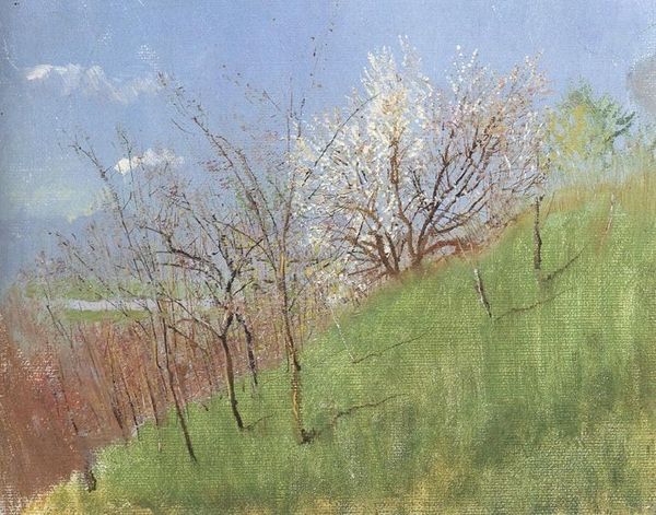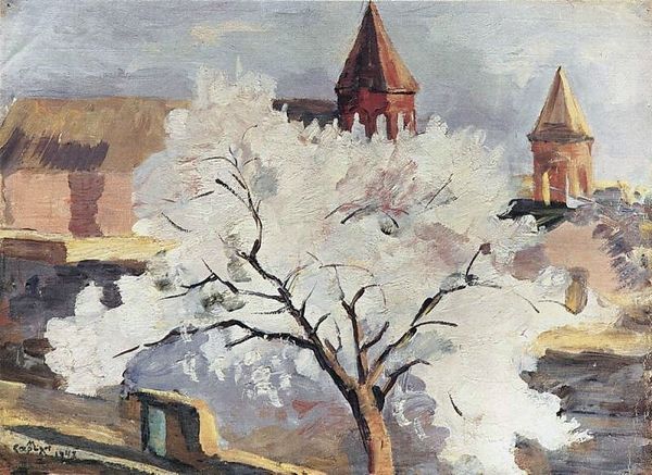 Editor: We're looking at "Spring Day," a 1935 oil painting by Martiros Sarian. There's an interesting tension in this landscape between what feels like peaceful blossoming and a kind of subdued, almost melancholic tone. How do you interpret this work, especially considering its historical context? Curator: It's fascinating to consider Sarian’s work through the lens of Soviet Nonconformist Art, isn't it? Here we have what appears to be a serene landscape, but created during a period of intense ideological pressure. Do you think the "melancholic tone" you picked up on could be read as a subtle act of resistance, perhaps hinting at the suppression of individual expression under the regime? Consider the way he employs elements of Orientalism, potentially asserting a specific cultural identity. Editor: That’s a powerful perspective. I hadn’t considered the cultural identity aspect so explicitly, more the overarching feeling of constraint. But I do see the tension in his choice of style, especially with post-impressionist brushstrokes that feel so individual. It's like he's celebrating the beauty of the world but within very defined boundaries. Curator: Precisely. And that brings up crucial questions: Whose spring day is this? Who gets to experience and represent it? Are the figures in the landscape participating in a shared vision of socialist utopia, or are they figures in a landscape subtly resisting the collective ideal? Think about the social and political implications of depicting figures so ambiguously, neither overtly celebrating nor directly criticizing. Editor: Wow, I didn’t think so much could be packed into a seemingly simple spring scene. This really shifts my understanding of Soviet art. Curator: It challenges us to look beyond the surface and recognize the multifaceted layers of meaning within art created under restrictive circumstances. The painting prompts us to reflect on how cultural and political landscapes can be both a constraint and a catalyst for artistic expression.