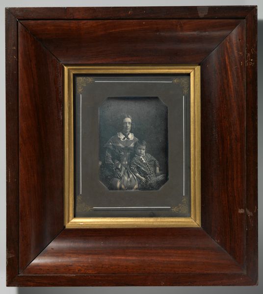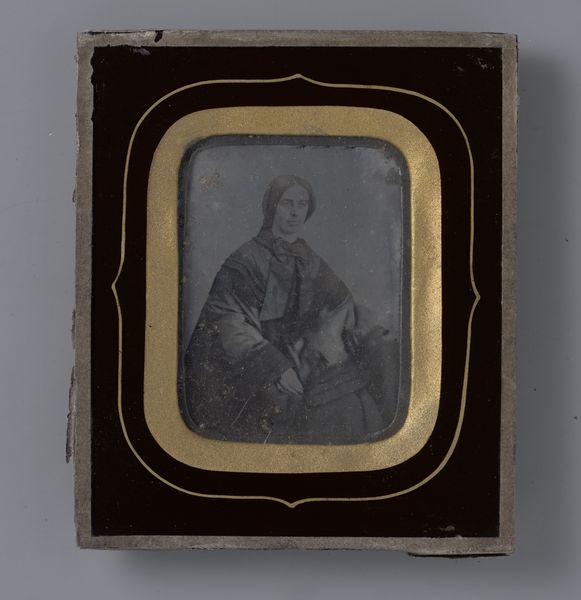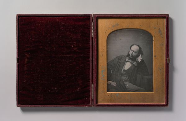 This photograph of an unknown woman by Paul Beuscher is presented within a striking case of velvet, a material once synonymous with luxury. The very texture invites touch, promising a softness that hints at the sitter's own gentility. But let's consider the velvet itself, a textile achieved through a labor-intensive process involving specialized looms. Its deep pile results from weaving extra sets of threads, which are then cut to create the dense, even surface. The production of velvet was a skilled practice, often associated with specific regions and workshops. The introduction of power looms in the 19th century, though, would have gradually democratized its availability, subtly shifting its social status. The choice of such a material for a photographic portrait—a relatively new medium at the time—speaks to the desire to elevate the image, blurring the boundaries between the industrial and handmade, the personal and the presentational. Ultimately, this work challenges us to consider how materials and making processes can imbue an object with layers of cultural meaning.