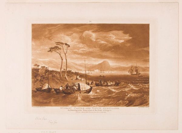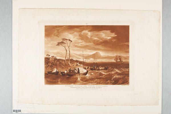 Editor: This is "The Breath of Wind" by Robert Daudet, made sometime between 1737 and 1824. It has a very dynamic composition, with a single tree contrasting with a sailing vessel in rough seas. What do you see in the contrasting forms in this print? Curator: Observe how Daudet employs varied etching techniques to articulate the textural differences between the placid figures and the tempestuous sea. Consider the dynamic interplay of light and shadow, effectively conveying depth and movement. What do you interpret from the curvature of the branches and sails? Editor: I guess there's a contrast between the people who feel safe on the hill, and the boaters who are fighting against the waves. Curator: Precisely. The artist uses formal elements to construct meaning, suggesting the unpredictable nature of life. We gain a richer understanding of Daudet's commentary on humanity's relationship with nature. Editor: That’s a fascinating perspective. I'll definitely look at other works with that in mind.
