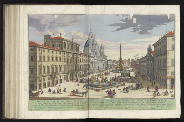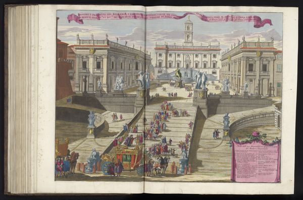Giovanni Battista Falda created this print of St. Peter's Square and Basilica in Vatican City sometime before his death in 1678. The basilica is the focal point, rendered with precision and grandeur, set against a backdrop of muted pastel tones. Falda uses a bird's-eye perspective to present the square, flanked by semi-circular colonnades. This viewpoint flattens the space, compressing the depth and emphasizing the geometrical layout, while also creating a sense of enclosure. The rigid symmetry and precise detailing reflect an interest in order, balance and the centralized power of the papacy. The square is populated by tiny figures, dwarfed by the architecture. This contrast in scale highlights the individual's place within a larger, divinely ordained structure. Falda’s print offers not just a depiction, but an interpretation of spatial and social hierarchies. The print invites us to consider how architectural forms can embody and communicate power.