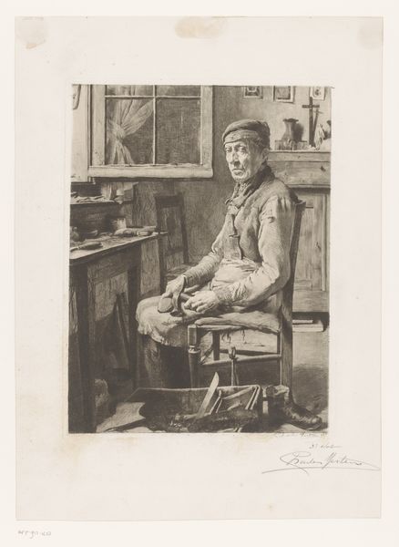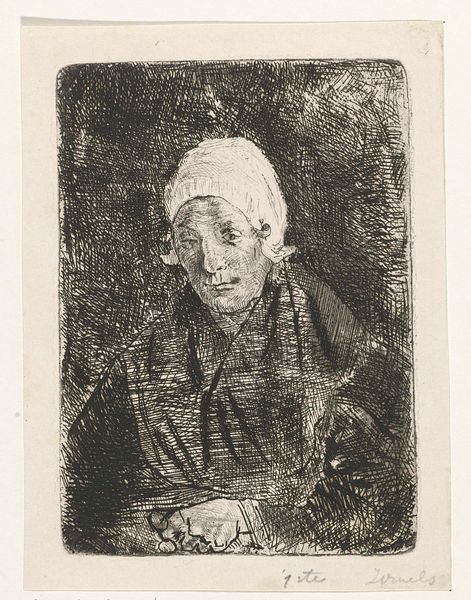 Jan Mesker made this print, Oude vrouw bij een raam, using etching, a process central to the graphic arts. This painstaking technique involves using acid to bite lines into a metal plate, which is then inked and printed. The matrix, in this case the plate, is of paramount importance, as the artist painstakingly prepared it to obtain this final image. Think about the labor-intensive work involved in preparing the plate with an acid-resistant ground, drawing into it with a needle, and then immersing it in acid. Mesker would have controlled the depth of the lines by carefully timing the acid bath, allowing for the creation of nuanced tonal variations in the print. He captured the intimate moment of an elderly woman seated by a window, her hands clasped over a book. The textures of her clothing and the delicate lace of the curtain are rendered with incredible detail, a testament to Mesker's skill. Considering these techniques and the amount of work involved, we can start to appreciate prints not just as reproducible images, but also as unique, highly crafted objects.