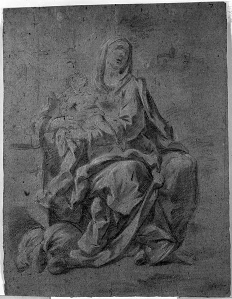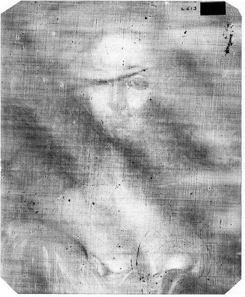 Curator: This is an X-radiograph of the "Virgin," after Il Sassoferrato, residing here at the Harvard Art Museums. An x-ray unveils hidden aspects of this iconic Renaissance image. Editor: It's ghostly, almost ethereal. The Virgin's bowed head and clasped hands speak volumes, even through the starkness of the radiographic image. What do you make of that veiled head? Curator: Veiling, of course, signifies modesty and devotion, key virtues projected onto the Virgin Mary within the socio-religious context of the time. The x-ray technique strips away color, revealing the density of materials and the artist's process. Editor: Precisely. It exposes the underlying structure, the very bones of the image, so to speak. The symbol of the Virgin transcends its aesthetic appeal; here it becomes an almost anatomical study of faith. Curator: Indeed, it highlights the intersection of art, religion, and scientific inquiry. It's a testament to our ongoing investigation into these revered symbols. Editor: Ultimately, this image prompts reflection on layers—visible and unseen—that give meaning to the enduring image of the Virgin.