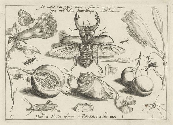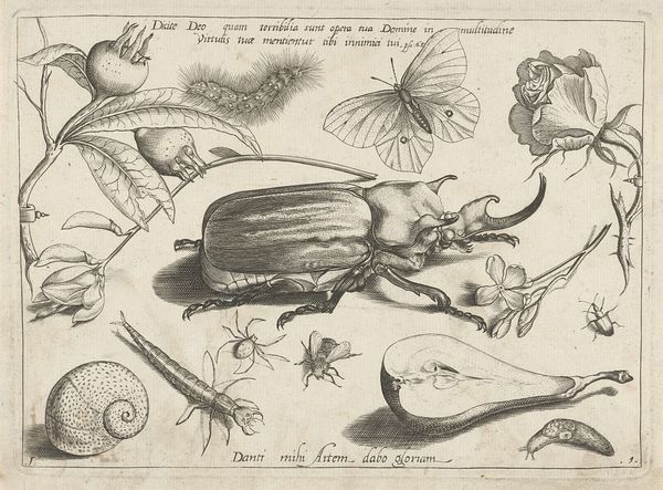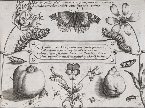 Jacob Hoefnagel created "Dieren, planten en vruchten rond een mot," or "Animals, Plants, and Fruit Around a Moth," as an engraving during a time when the natural world was both a source of scientific inquiry and symbolic meaning. This piece is a detailed observation of nature, typical of the Northern Renaissance. It reflects a growing interest in the natural sciences. The careful rendering of each insect, plant, and fruit invites us to consider the intricate relationships within the natural world. The presence of both “flos” and “cinis” (flower and ash), suggests a symbolic exploration of the cycle of life. What does it mean to pair an image of delicate lilies with a moth? The moth, often associated with transformation, could reference the transition from life to death. Hoefnagel seems to remind us of the fleeting nature of beauty and existence. Look closely, what feelings does the image evoke for you? Is it wonder, or perhaps melancholy?