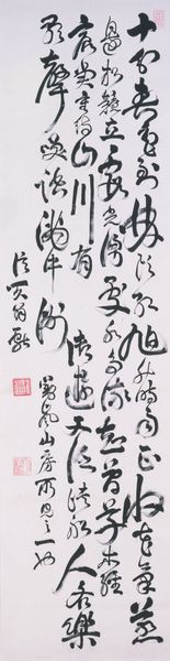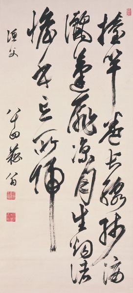 Curator: Let's spend a few moments with Shitao's "Prunus in Flower" created in 1694 using ink on paper. What do you think of the artwork's first impact? Editor: It feels…like a song barely whispered. Quiet. There’s an incredible dynamism in the starkness of the ink, but also a lightness that lifts the whole scene. It's an immediate and subtle impression. Curator: You have captured it wonderfully. The prunus, or plum blossom, carries rich symbolic weight in Chinese art. It's a herald of spring, rebirth, resilience… Editor: Exactly, a potent emblem of survival because it blossoms even amidst the cold of winter! Look at the way the bare branches reach, defying the blank space, bursting forth. But then the calligraphy too becomes interwoven as part of the composition; a testament of a season. Curator: Precisely. The poetry integrated with the brushstrokes. And while this monochrome palette is strikingly simple, it is used so well, even sparingly, which evokes a depth of space and time, if I can express myself in these terms! Editor: You can, you can! It suggests an ongoing renewal, and that bold trunk anchored in the corner offers reassurance. What's especially interesting is the absence. The 'emptiness' feels significant. The prunus flowers aren’t overwhelming; there's a restraint, almost a modesty to its show, wouldn’t you say? Curator: Absolutely. Shitao embraces emptiness as a vital component—like the rests in a musical piece that are just as essential as the notes! It asks for contemplation and that’s what connects to one’s soul I feel. Editor: Beautiful. It is more than what we actually see. Curator: Exactly. It is what it brings to each one of us.