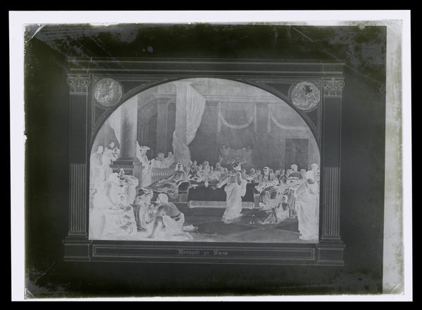 Curator: This is a fascinating photograph titled "Belly Dancer in an Arab Theater" by G. Lékégian. Editor: The stark contrast and the way the figures are arranged really give a sense of staged performance, almost like a diorama. Curator: Precisely. It’s crucial to remember how Orientalism shaped Western perceptions, and how the dancer's performance might have been perceived through a colonial gaze, reinforcing stereotypes. Editor: I'm struck by the tangible materiality of the backdrop, the heavily draped fabric, and the furniture, which speaks to a constructed image of the East, far removed from authentic lived experiences. Curator: The image offers a glimpse into the complex relationship between the artist, the subjects, and the intended audience, revealing layers of power dynamics within representation. Editor: Indeed, seeing this today reminds us of the role that photography played in shaping those perceptions, and how vital it is to examine its production. Curator: Absolutely. It is essential to consider this artwork in light of ongoing discussions about identity, representation, and cultural appropriation. Editor: A pertinent point, it really highlights the importance of historical context in understanding the artwork.