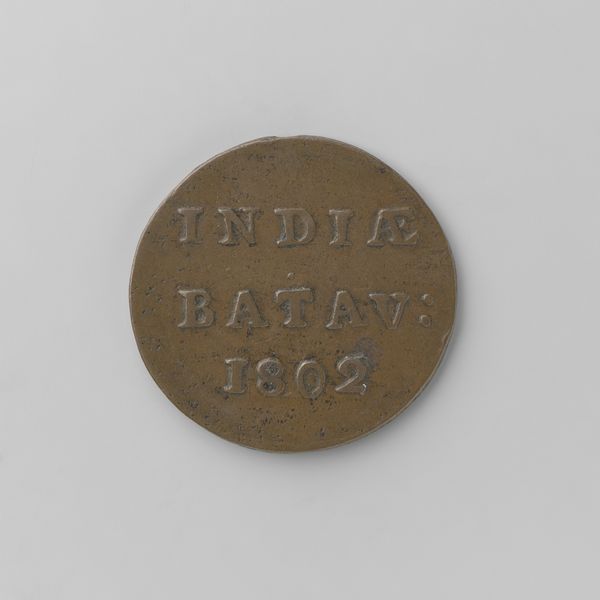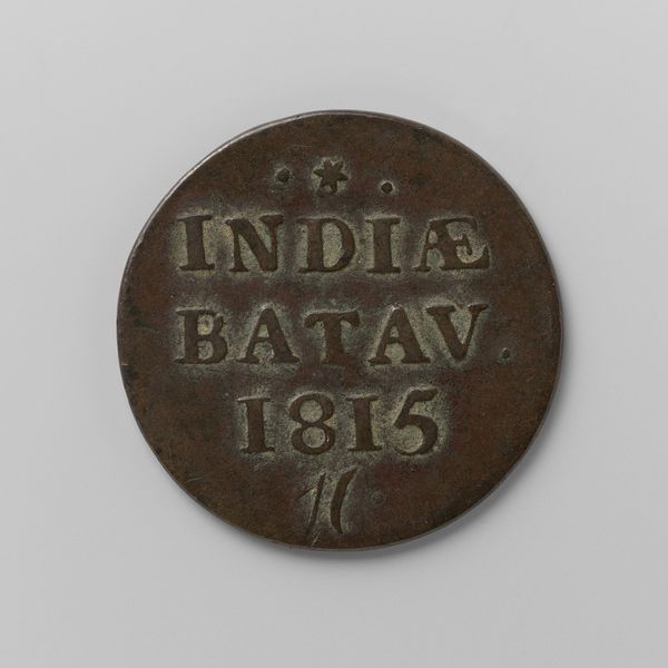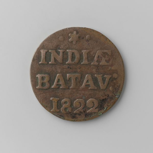 This Half Stuiver coin from the Dutch East Indies was authorized by King Willem I in 1821. Minted from copper, its circular form and stamped design speak to the power of industrialization and colonialism. Consider the qualities of the metal itself: its reddish hue, its relative softness, and its ability to be cast and impressed. These features made copper an ideal medium for producing currency on a massive scale. The coin's design – inscriptions denoting its value and origin – was likely achieved through the use of a die, a hardened metal stamp that could quickly and consistently imprint the image onto the copper blanks. This coin represents more than just a monetary denomination; it embodies the complex relationship between the Netherlands and its East Indian colonies, the circulation of wealth, and the systematic extraction of resources. It’s a potent reminder that even the smallest, most commonplace objects can carry significant social and political weight, blurring the lines between art, craft, and the mechanics of empire.