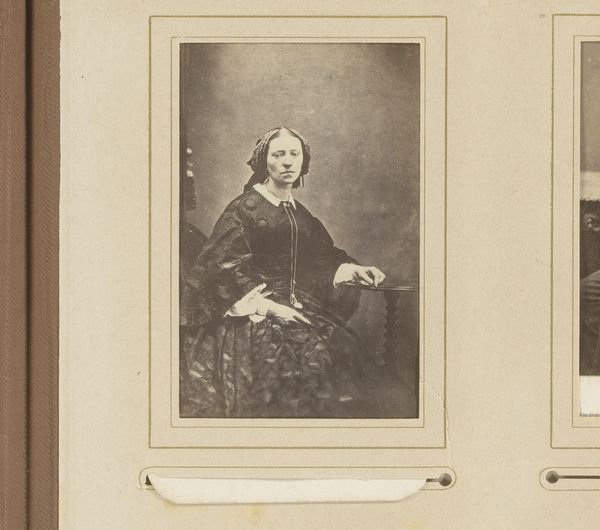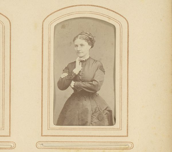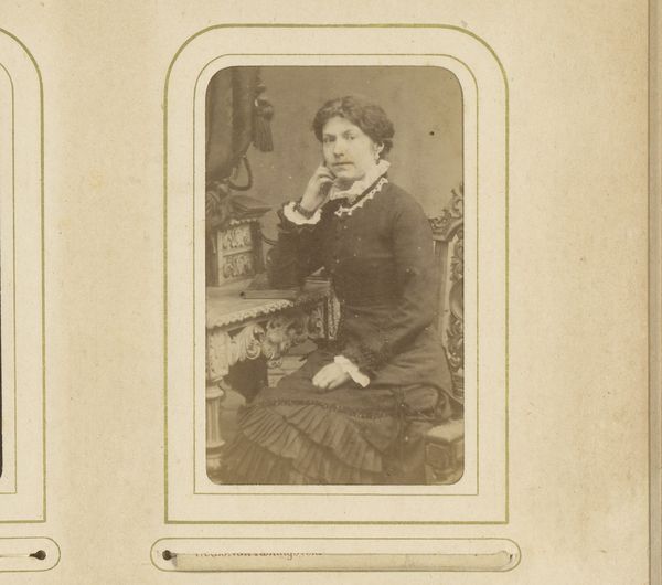Editor: Here we have Albert Greiner's "Portret van een jonge vrouw met pijpenkrullen, staand bij een stoel", or "Portrait of a young woman with pipe curls, standing by a chair" created sometime between 1861 and 1887. It's a photographic portrait, and it gives off a really formal, almost stern feeling. What strikes you most about it? Curator: Well, immediately, I’m drawn to the material processes at play. Think about what went into creating this image – the photographic chemicals, the glass plates, the posing chairs carefully manufactured and draped. The young woman’s clothing as well-- where did that material come from, what were the social relations required for its fabrication? And how does this compare to portrait making processes of our own time? Editor: I hadn’t considered the manufacturing. Curator: It's vital! Look at the deliberate way in which this was captured-- not candid but very calculated. Consider how each element reflects a specific social stratum and set of production methods. Her bow for instance, or her dress, speak to certain expectations of what that particular segment of society would buy. What are your thoughts on who might've commissioned such a photograph? Editor: Perhaps someone of a relatively new middle-class looking to document themselves in a dignified manner. So it is about aspiration as much as documentation, then. Curator: Precisely! Think of the act of photographing as an industry in and of itself. Each pose, backdrop, even the hairstyles we see, are the results of deliberate actions tied into larger economic forces. In fact, what looks seemingly simple at first actually exposes a complex web of making and consuming. Editor: That's given me a new appreciation. Looking beyond just the image itself to understand its manufacturing background brings a totally different meaning. I'll be paying closer attention to this production process moving forward. Curator: And that enhanced observation and attention to production, my friend, that is the goal.