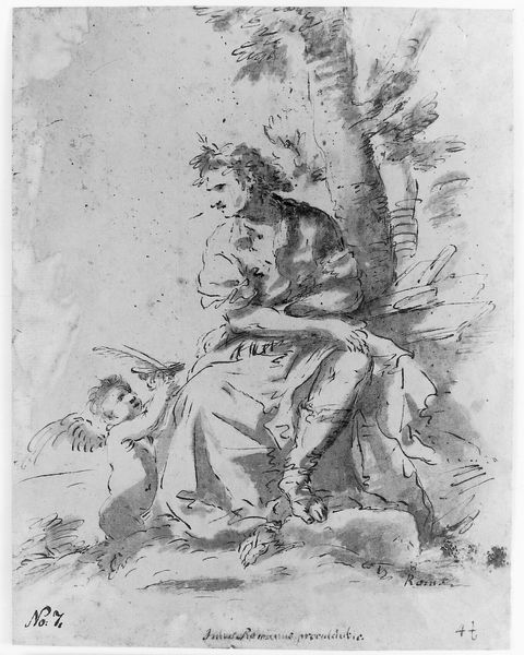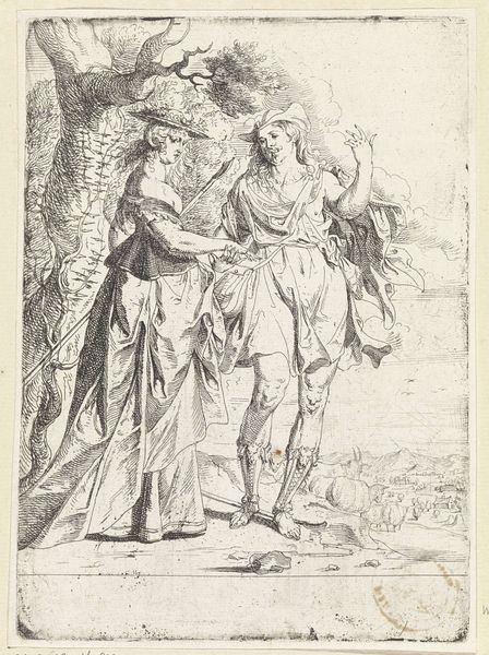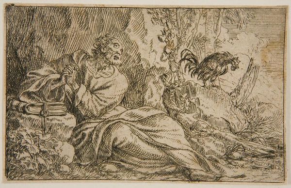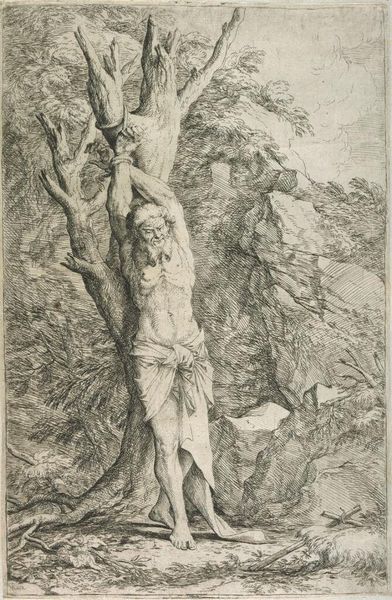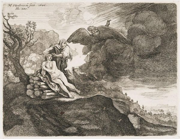 Curator: This is Rembrandt van Rijn's etching, "Abraham's Sacrifice," an intimate portrayal of a pivotal biblical moment. Editor: The raw emotion just leaps out, doesn't it? It feels like a struggle caught mid-act, a desperate intervention. Curator: Absolutely. Rembrandt masterfully uses light and shadow to amplify the drama, highlighting the angel's forceful grip and Abraham's conflicted expression. Sacrifice is a recurring theme across cultures, a test of faith. Editor: The angel looks almost panicked, like a divine force overwhelmed by human will. And Abraham, is he resisting or resigned? That knife hovering feels like a threat, but also a question. Curator: The composition cleverly contrasts the divine intervention with the stark reality of human obedience. That starkness lends power. Editor: It makes you wonder about the weight of tradition versus the call of compassion. I am very conflicted about this image. Curator: It’s a powerful work. Its resonance, across centuries, shows how images encapsulate our deepest fears and questions.